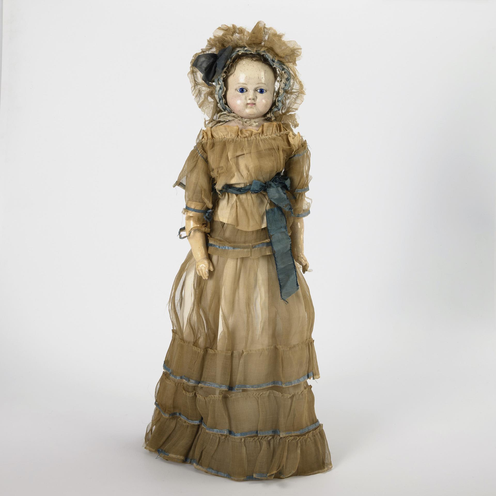 Waxed chest head, firm blue eyes, glued-on blond curls. Cloth body stuffed with excelsior with mass arms, waxed legs with molded boots. Presumably original, tattered tulle upper dress, matching hood, added white underdress. Signs of age. Nose and chin retouched, right leg taped with plaster.
