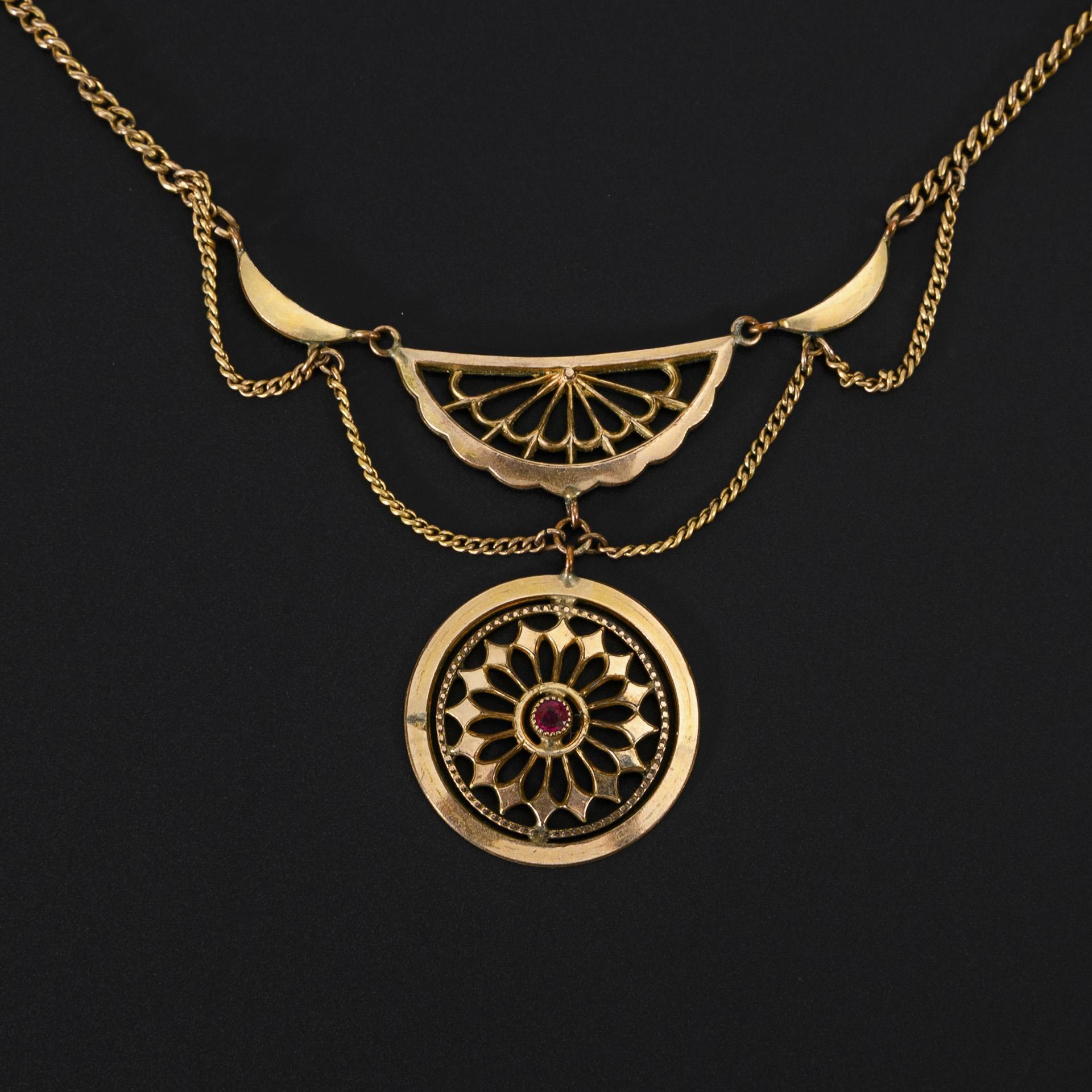 Typical necklace with chain suspensions and round pendant element, set with a small red gemstone, probably glass, on original chain. Slight signs of wear commensurate with age: gilding with rubbing in places.