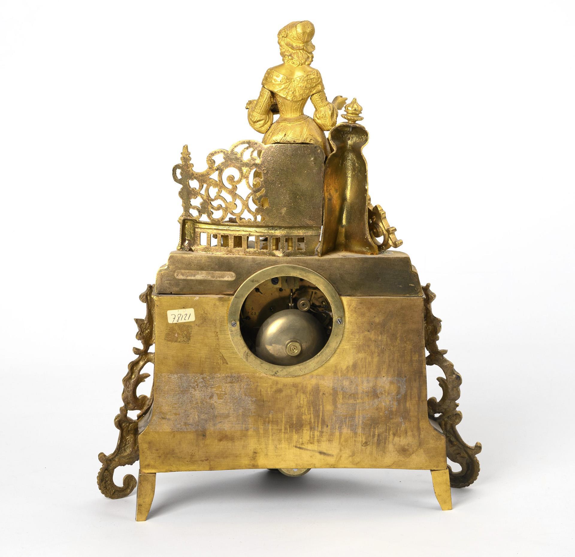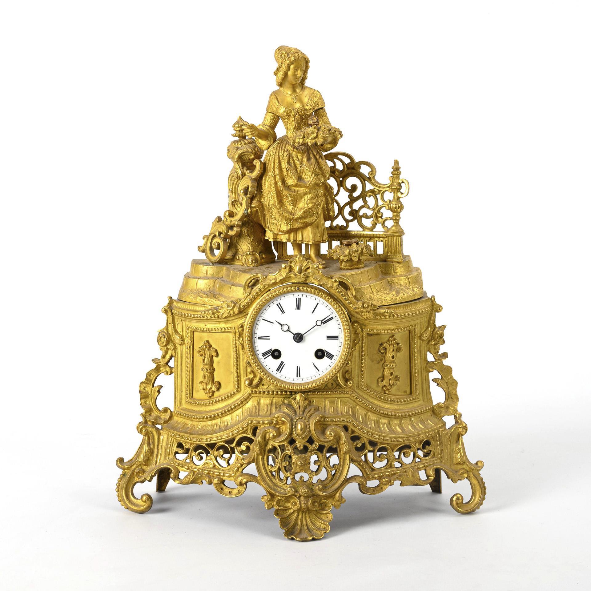 High ornate base in Baroque style with a crowning female figure with floral decoration on a balcony. Slight signs of age and wear, dial with defect, figure and individual parts loosened.