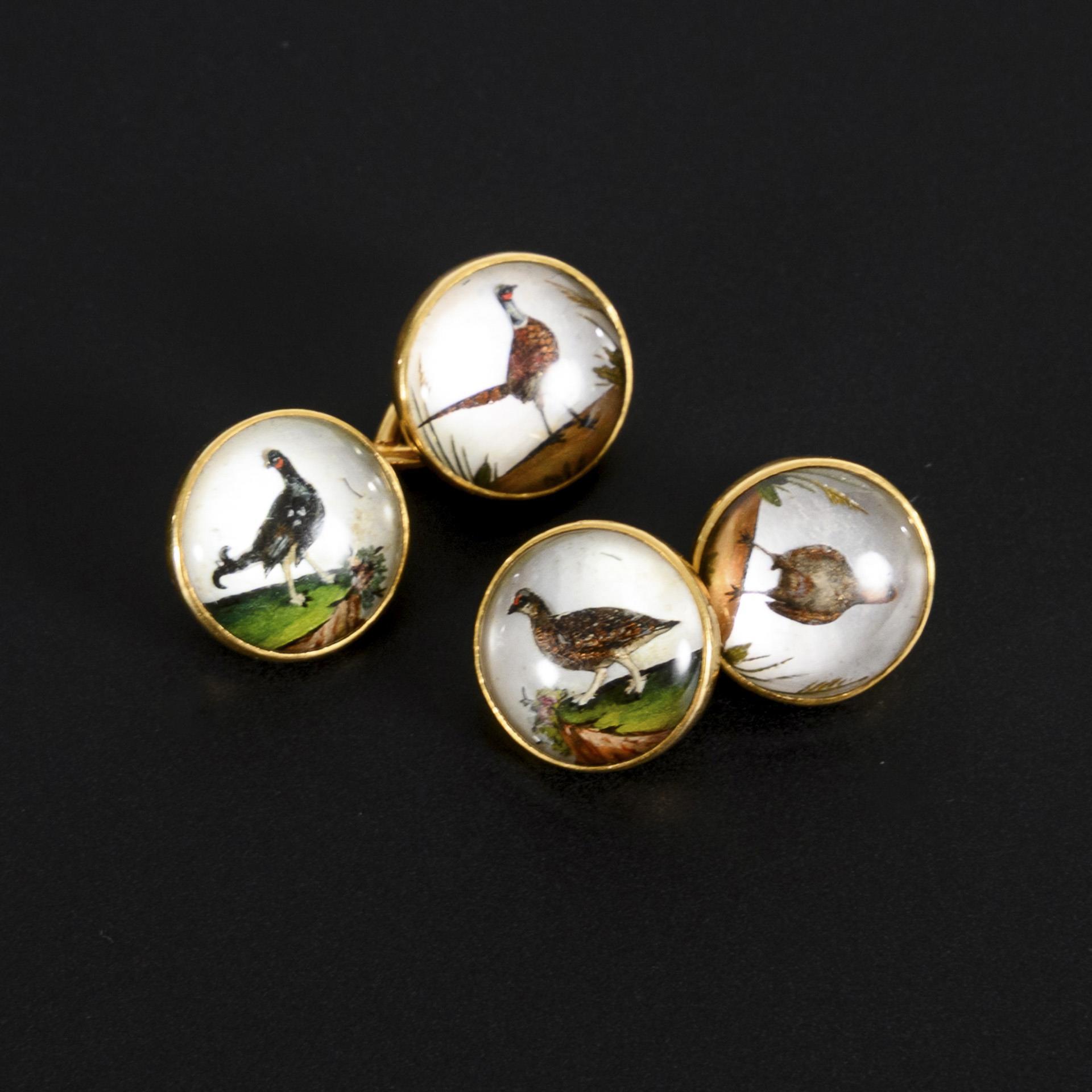 A pair of cufflinks with depictions of pheasants and capercaillies, the male and female animals each on a cufflink, probably Essex Crystal of the 2nd half of the 19th century with mother-of-pearl underneath. In this technique, rock crystal cabochons are figuratively cut on the back and the intaglio is then colored.
