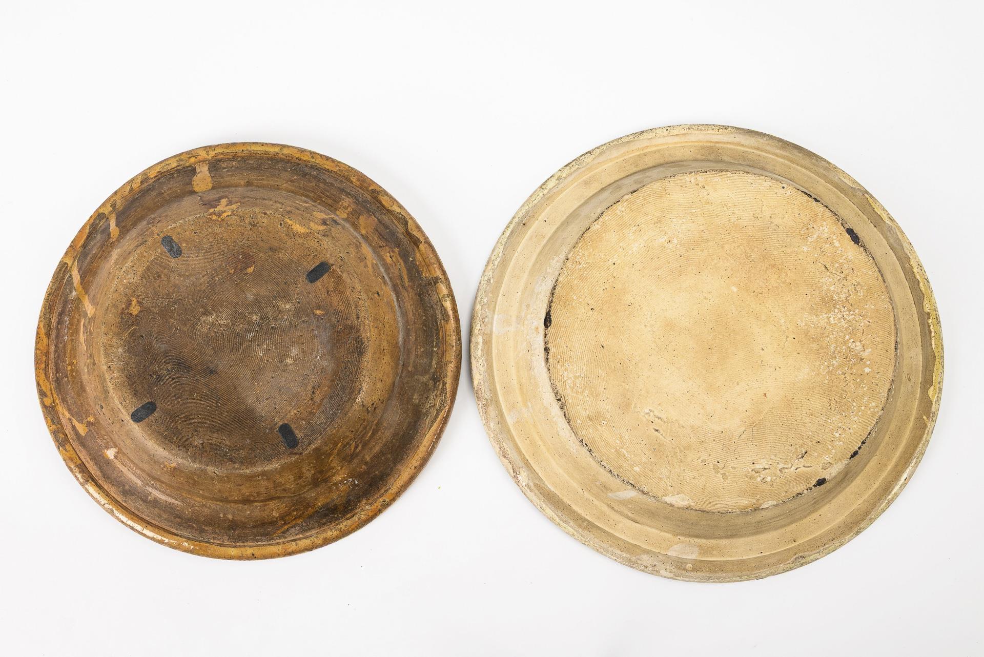 Earthenware, glazed in color, colored slip painting. Ø 27.5 and 30.5 cm. Total weight 2 kg.