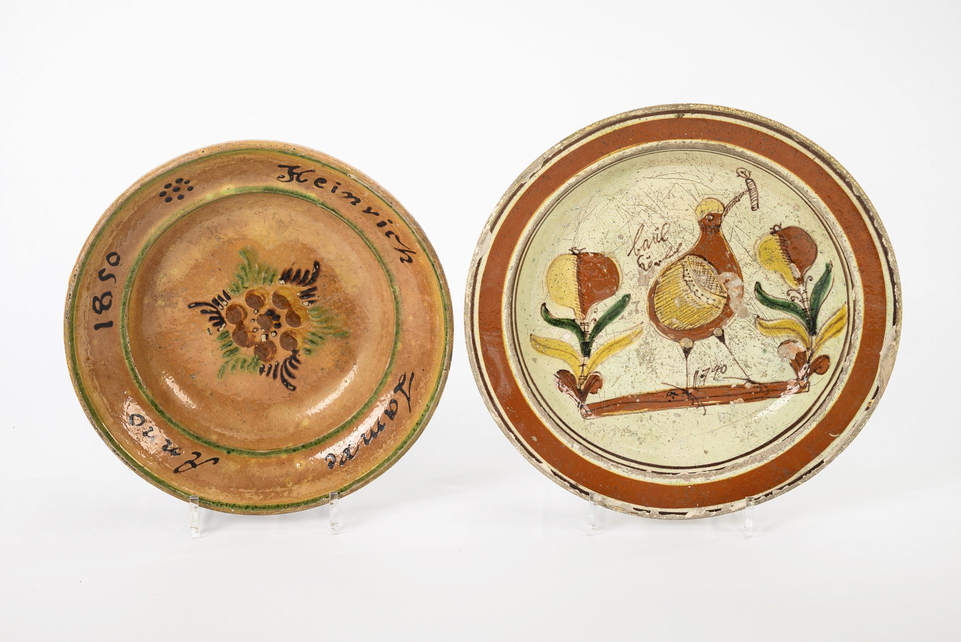 Deeply hollowed, round plates, 1x with floral decoration, circumferentially dated and inscribed "Anno 1850 Heinrich Lampe", 1x a bird motif between large flowers, indistinctly inscribed and dated "1740". Signs of age and wear, knocks, glaze rubbing.