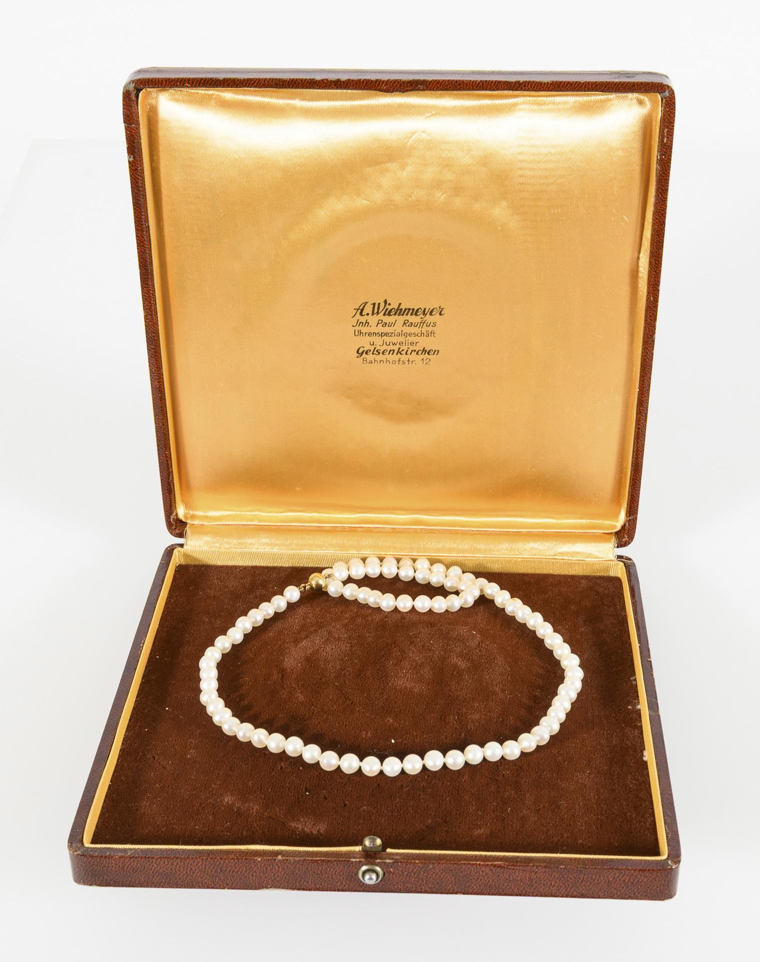 Elegant, delicate pearl necklace made of individually knotted pearls. Pearls with natural growth characteristics, predominantly slightly oval in shape.