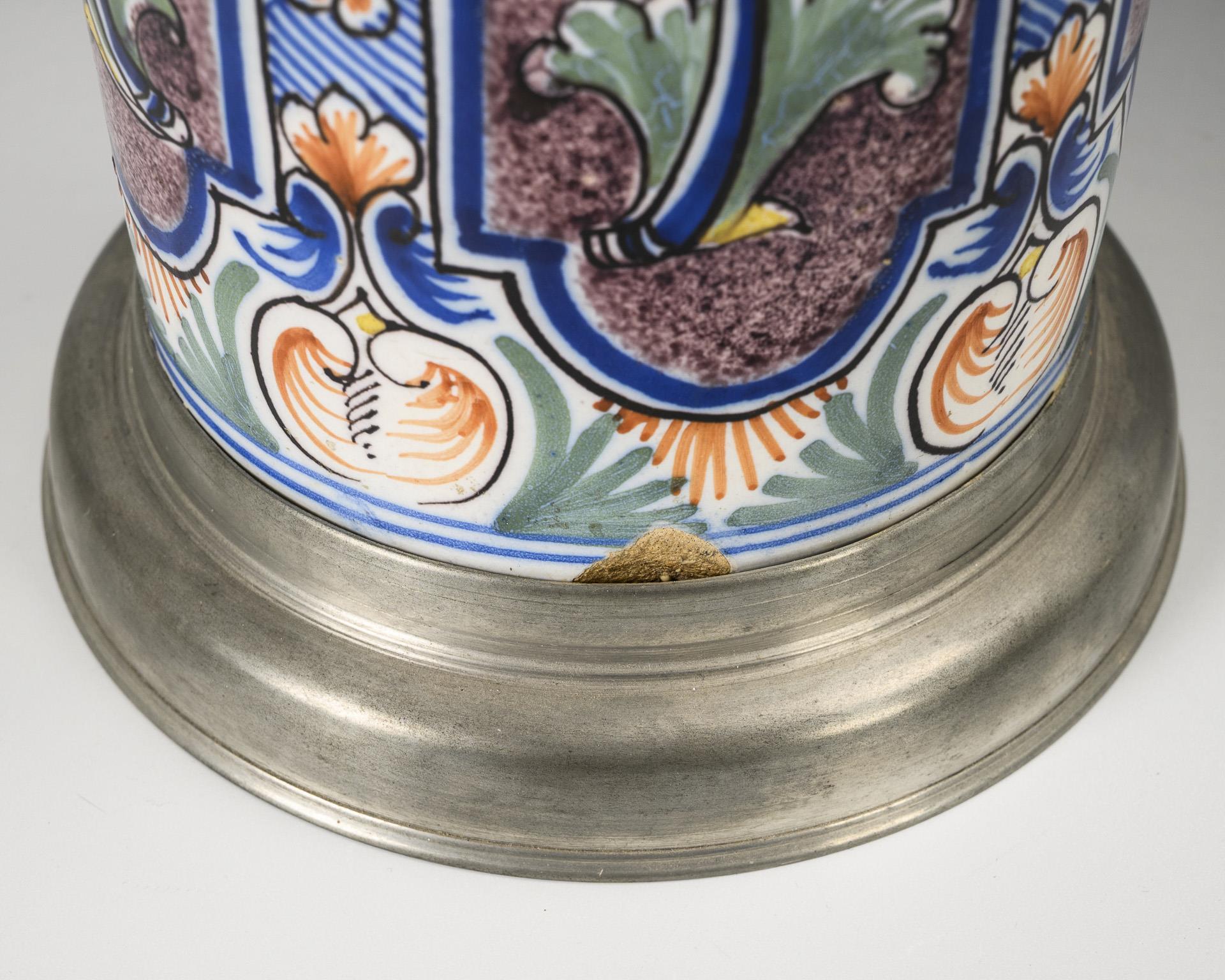 Cylindrical body with ribbon handle, 3 flower-filled, manganese-painted baroque reserves on the front, floral decoration all around. Pewter lid with ball pusher, high pewter level. Wall crack (glued inside), bottom cracked, partially bumped.