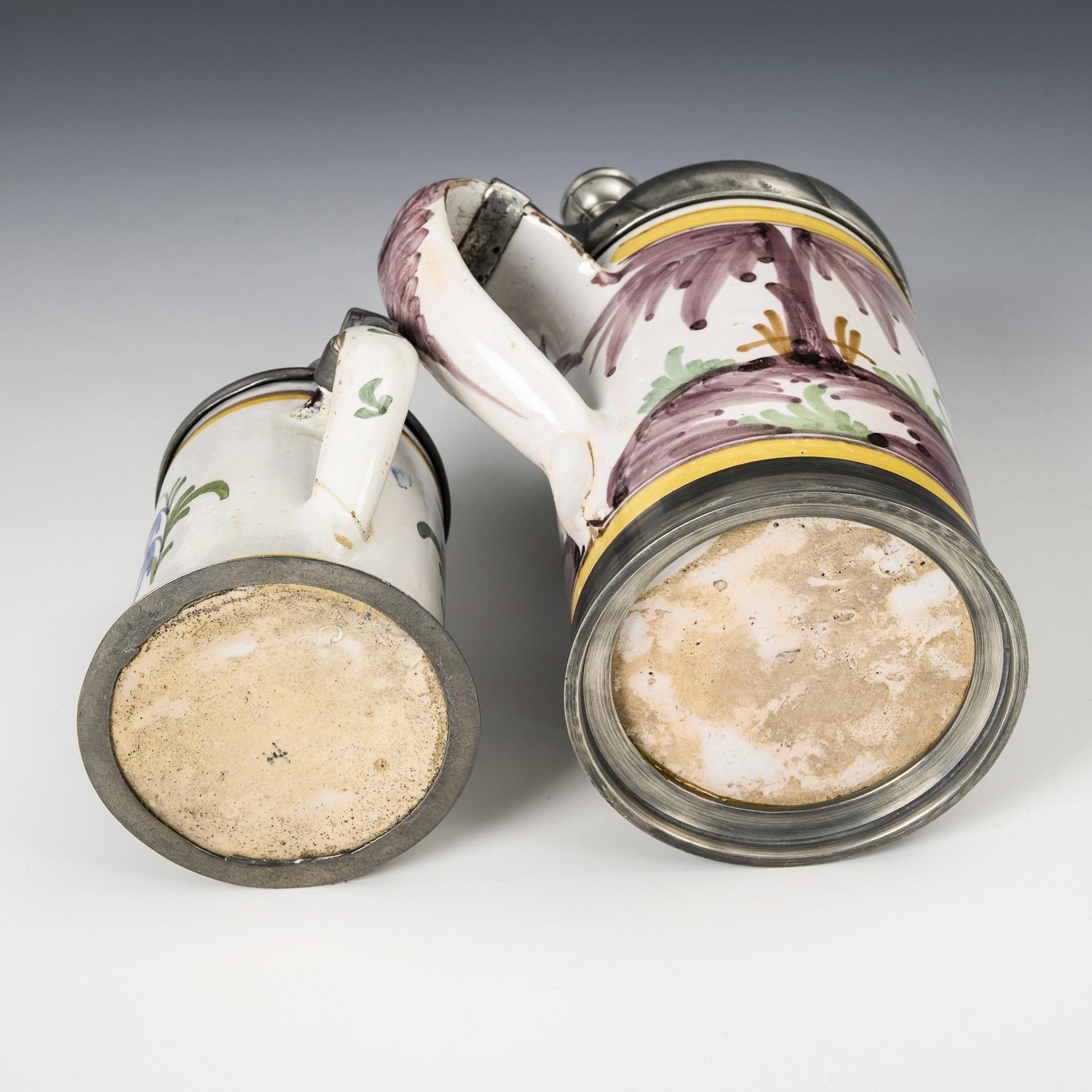 Each cylindrical body with ribbon handle, 1x Schrezheim: bird on branch, 1x Hannoversch-Münden: jumping horse in landscape with palm trees. Each with pewter lid with ball finial, partly engraved and hallmarked. Small jug with cracked wall and glued handle. Each with chips to the glaze.