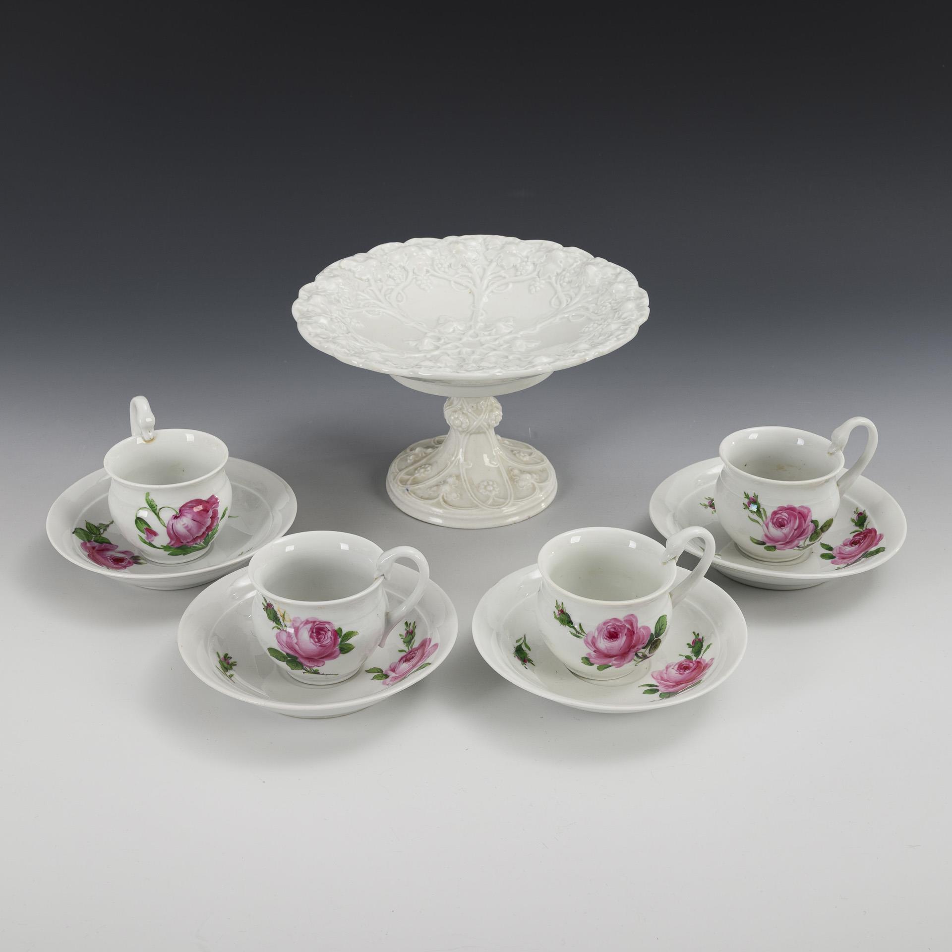 1 white relief centerpiece with vine-relief plate and gothic relief foot (H 13 cm). / 4 "Red Rose" paintings: cups with swan handles (H 7.5 cm) and original saucers (Ø 14.5 cm).
