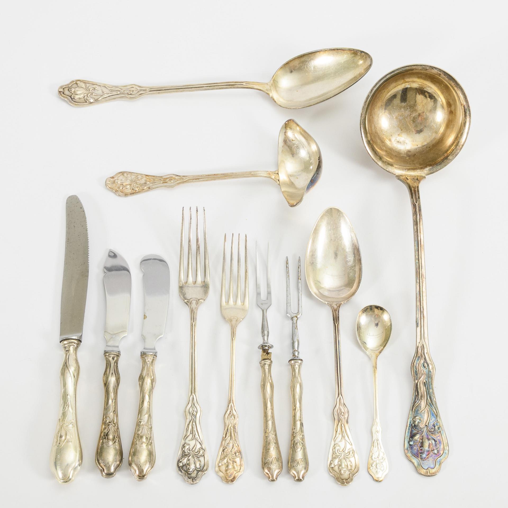 56 parts. Art Nouveau design with flower motifs in relief, each with engraved monogram "M". 4 dinner forks, 18 small or pattern forks, 3 dinner knives, 2 butter knives, 2 cheese knives, 8 dinner spoons, 11 dessert spoons, 4 skewers, 2 serving spoons, sauce ladle and ladle. With signs of use commensurate with age.