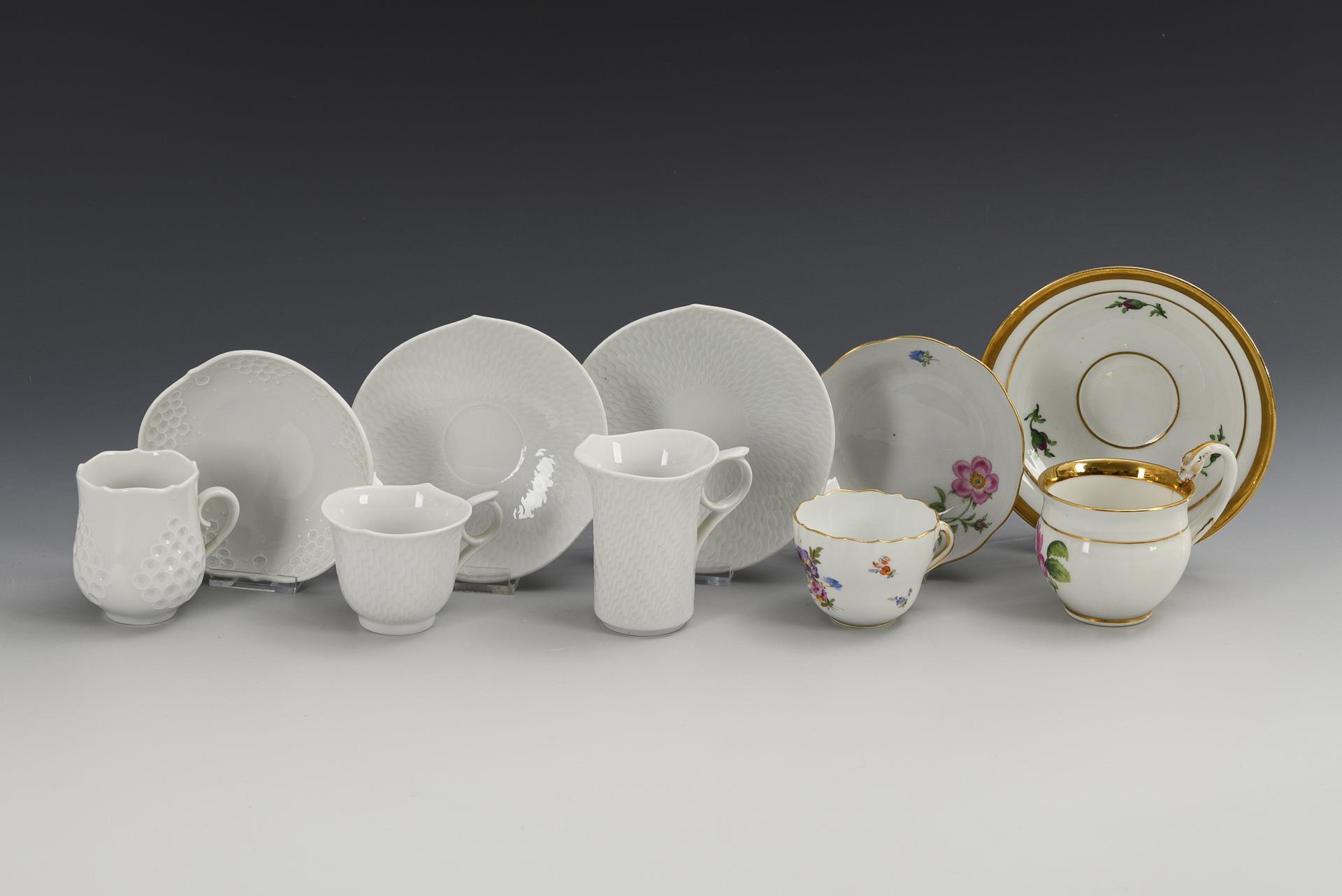 2x polychrome painted and gilt, 3x white. 5 cups (H 5-8 cm), 5 saucers (Ø 11-14 cm). 1 kg.