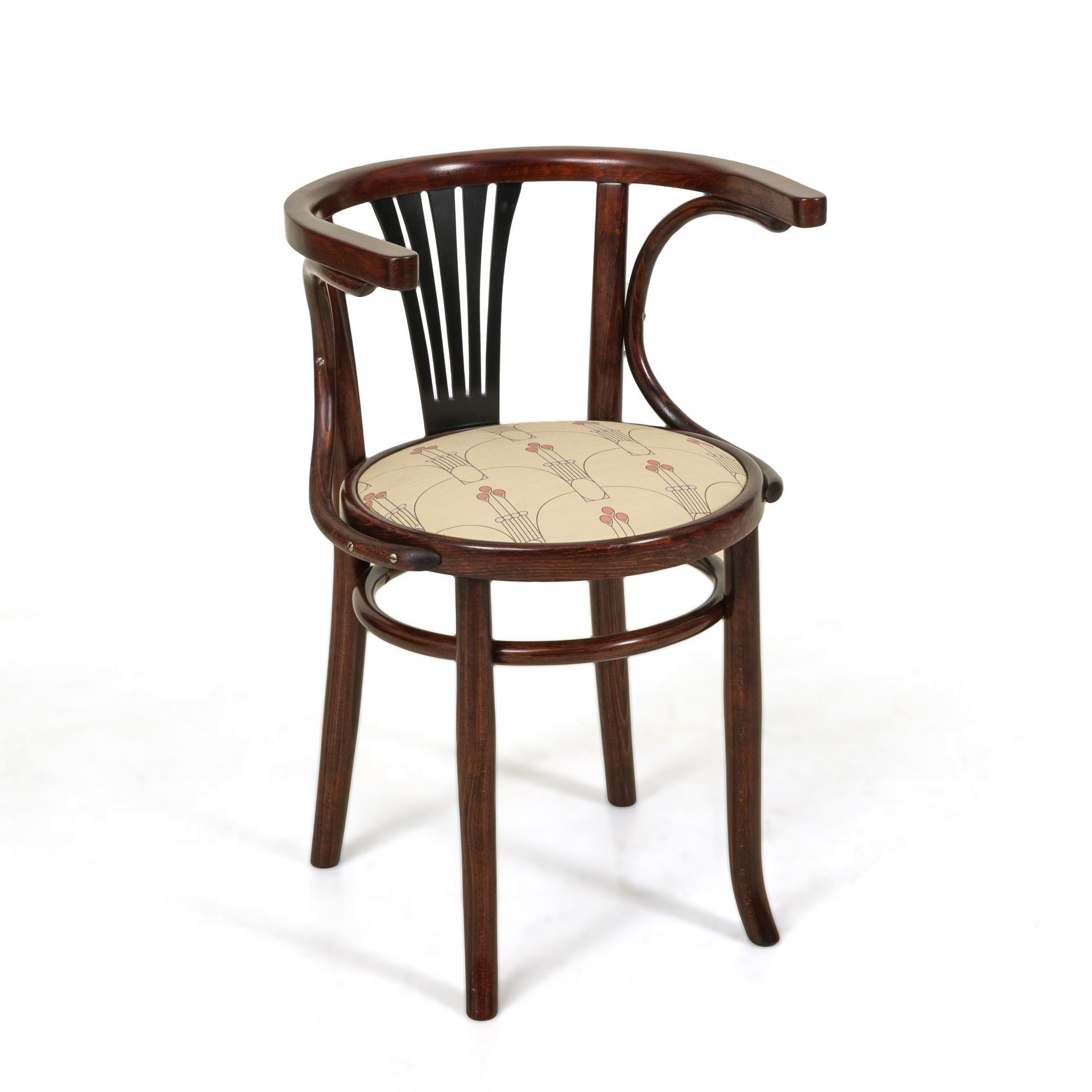 Younger replica of the rounded armchair with fan-shaped backrest and curved side supports, upholstered seat with light, stylized floral patterned fabric after a design by the Wiener Werkstätten, on 4 concave legs with ring bracing.