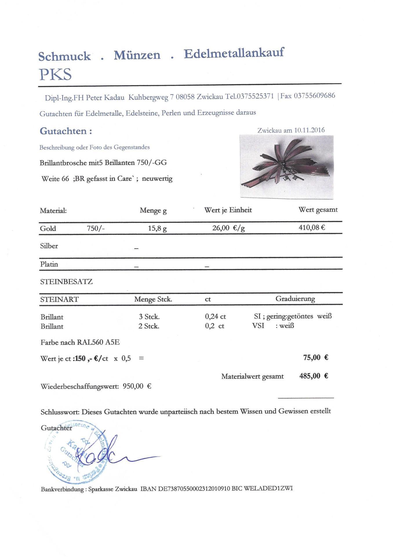 Marked 750 yellow gold. Brilliant-cut diamonds 3x 0.24 ct/SI/low-toned white, 2x 0.2 ct/VSI/white; dimensions of the brooch max. ca. 6.4 x 2.9 mm. 15,8 g.