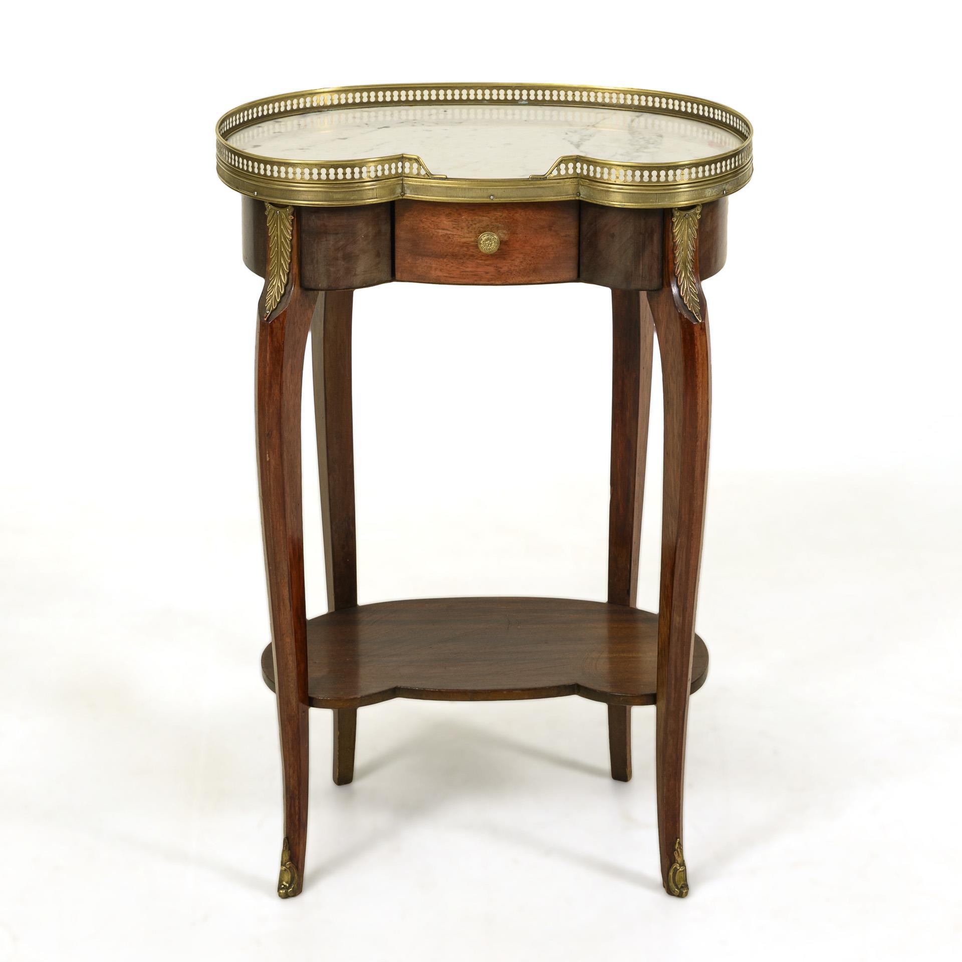 Kidney-shaped, 1-tier body in transitional style, white-grey marble top with brass railing, clipboard, 4 s-shaped curved pointed legs with brass acanthus leaf fittings. Brass rosette knob. Slight signs of age and wear.