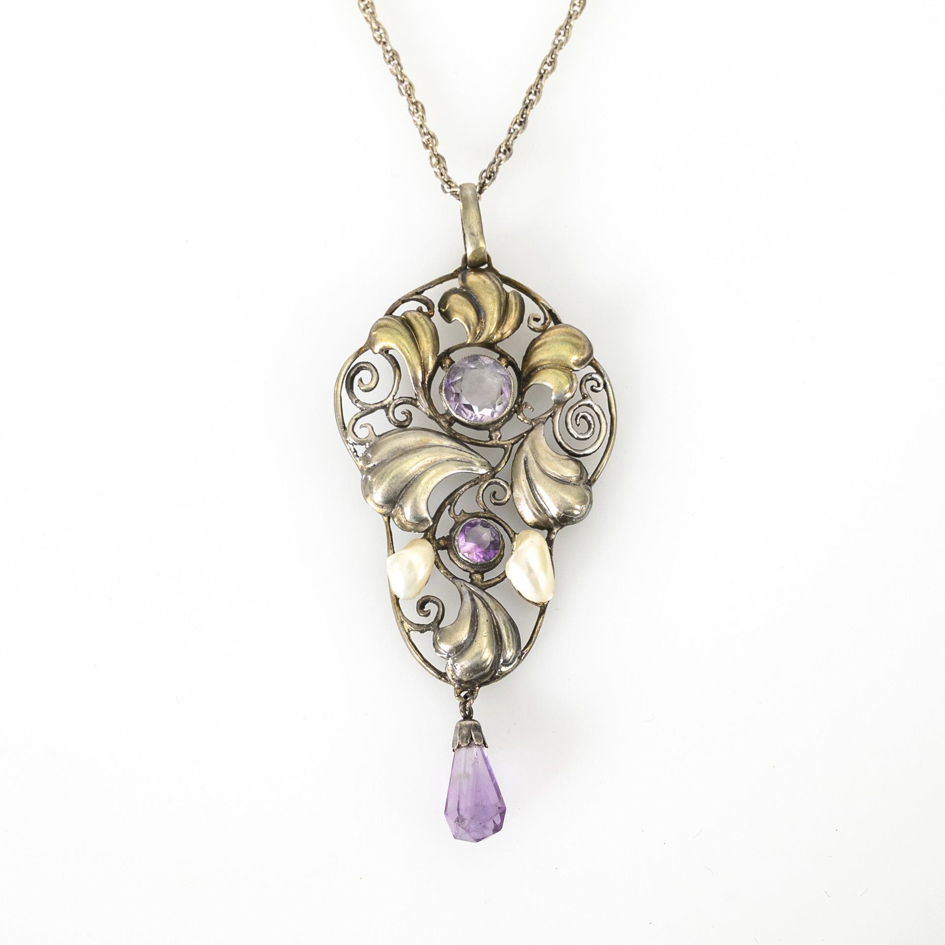 Pendant in Art Nouveau design with 3 amethysts, one of them as suspension, as well as 2 pearl halves set in a two-tone design characterized by tendril pattern and leaf elements. Based on comparative pieces, the pendant can probably be dated to between 1906 and 1915. The necklace was probably added more recently.