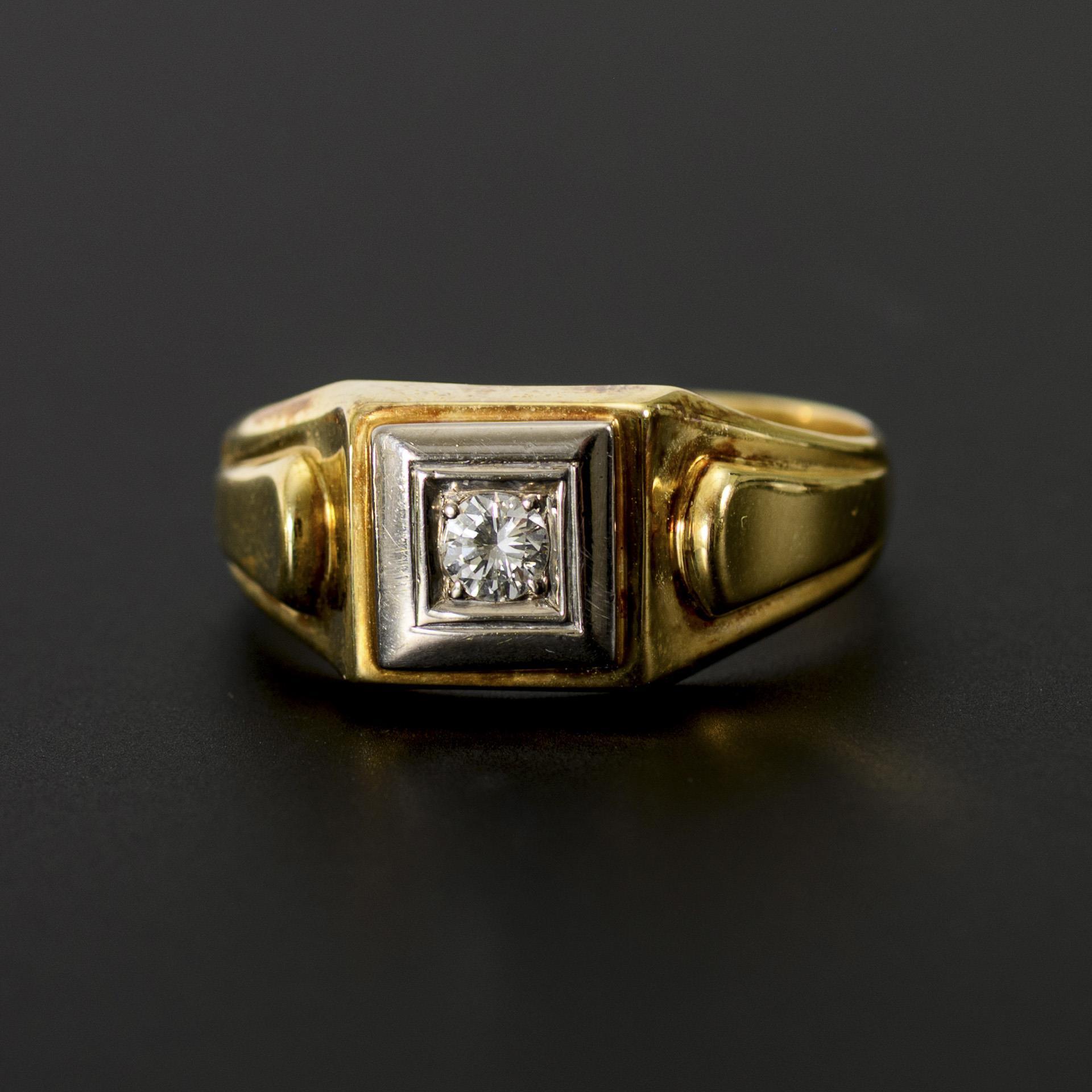 Broad ring in two-tone design with brilliant-cut diamond solitaire in square setting. Gold slightly tarnished in places, discreet traces of a former ring shank extension on the underside.