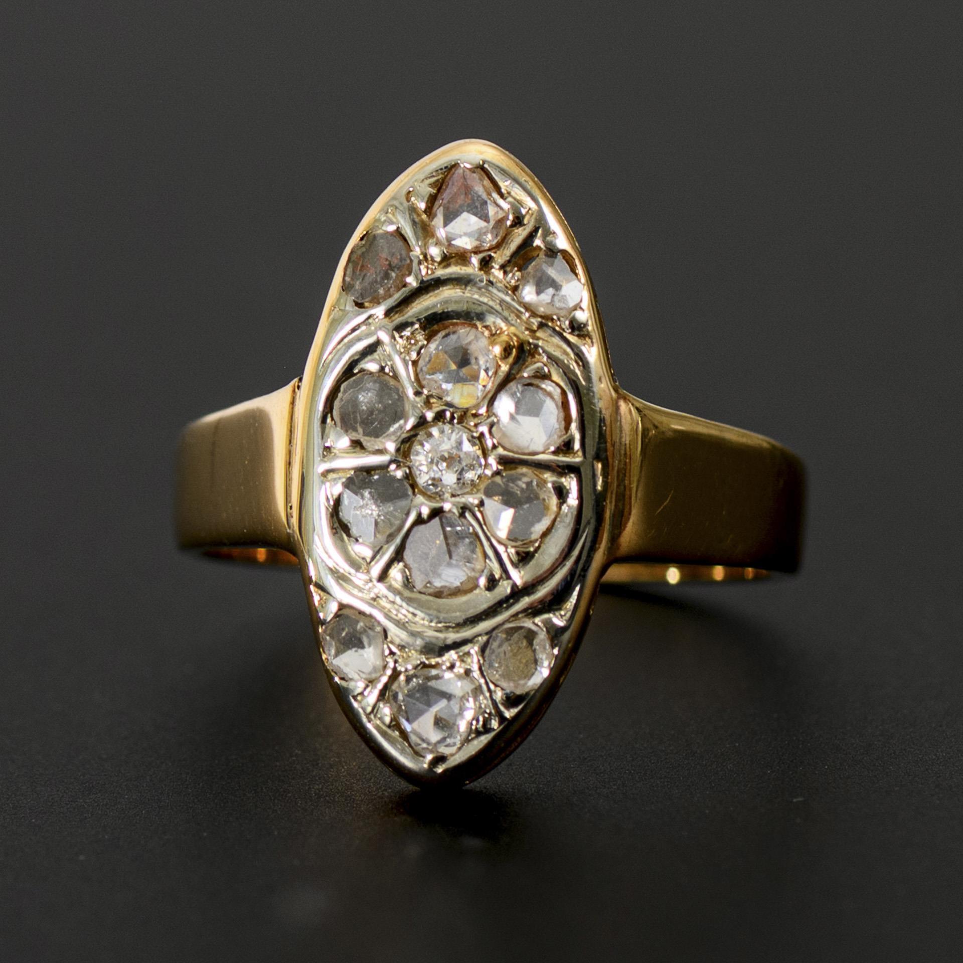 Historicizing navette or boat-shaped ring with diamonds in a historic or historicizing rough cut. In the center, a flower-shaped element with a small old-cut diamond.