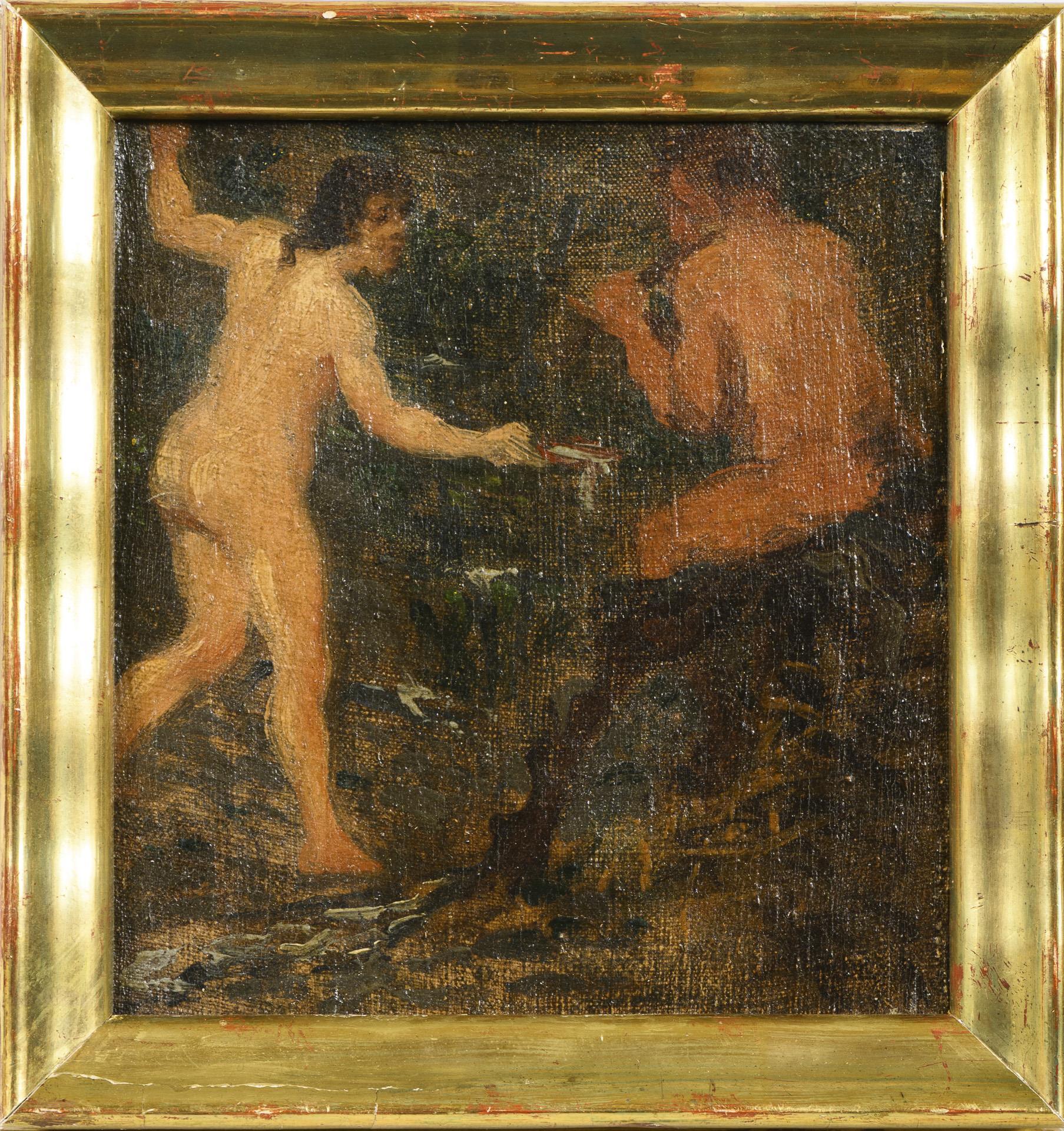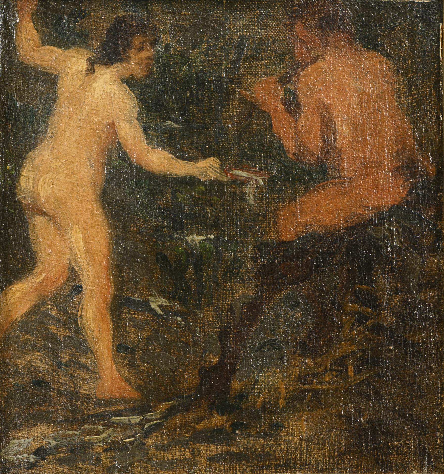 The naked nymph by the water with the faun playing the flute. Slight traces of age.