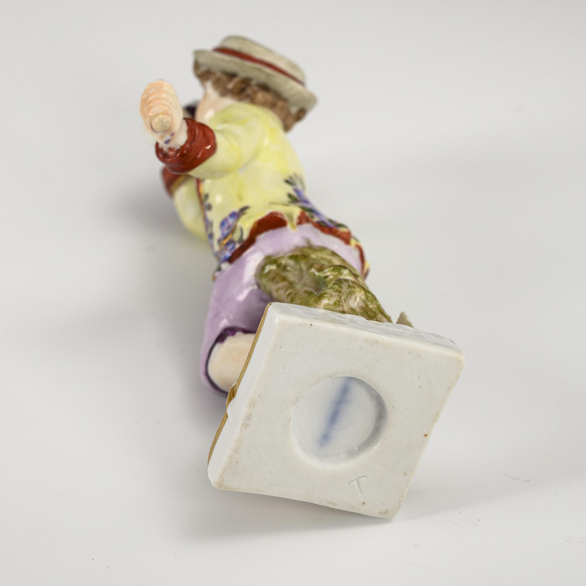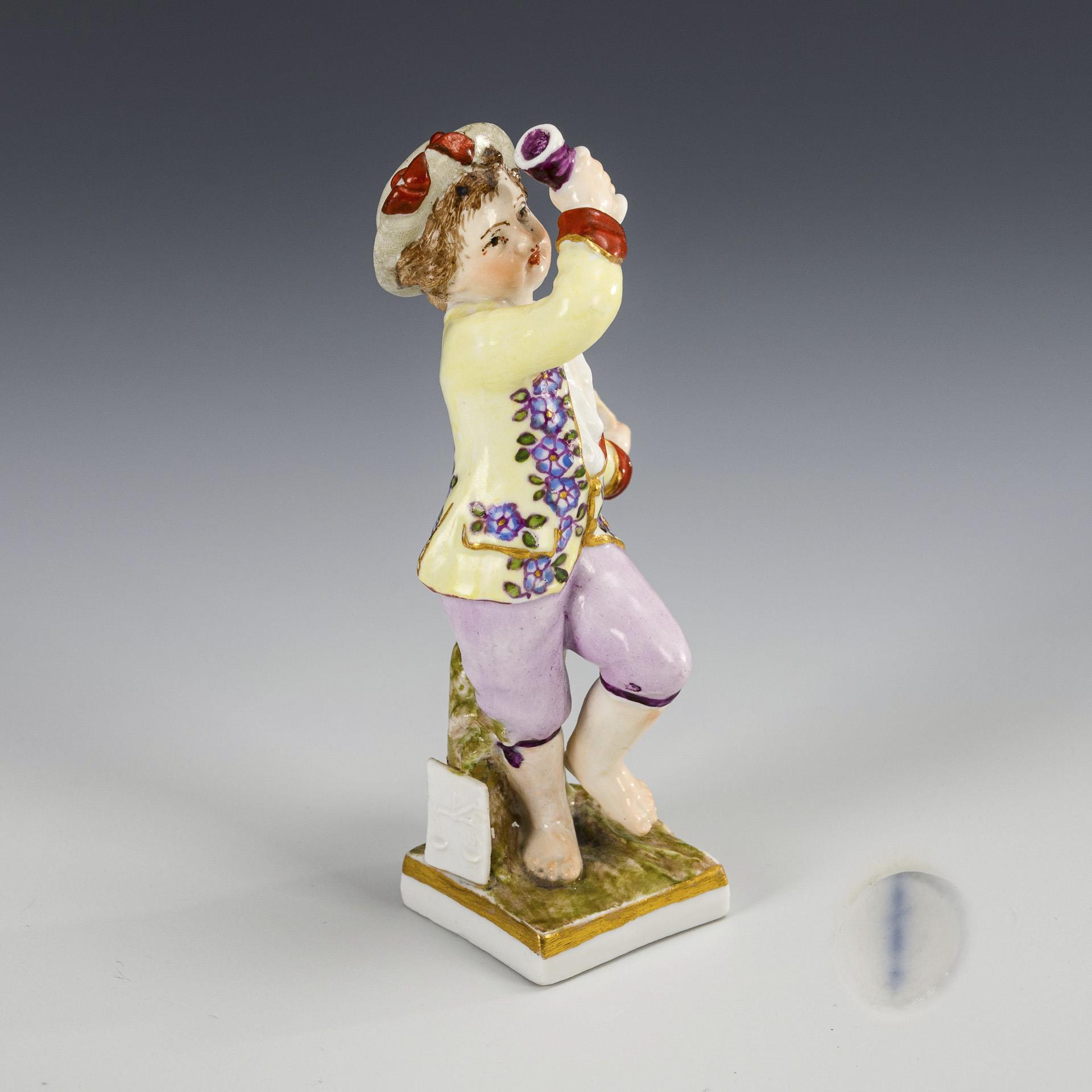 Gardener's boy standing on a tree trunk with a wine glass, at his feet a shield with a relief of the scales, inscribed "Oktober" on the reverse. Right leg restored.