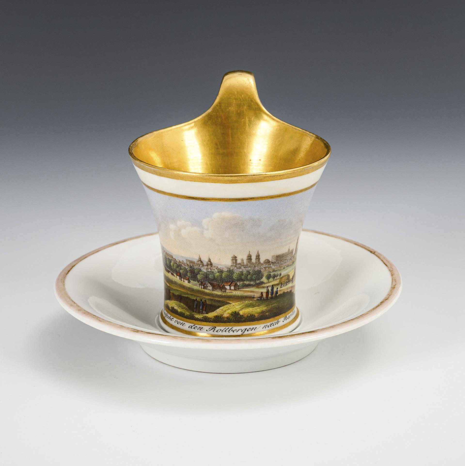 Cratered cup with high curved handle. On the front a gold-framed rectangular cartouche with the inscribed view of the city of Berlin from the Rollberg, gilded inside. Saucer gold rubbed.