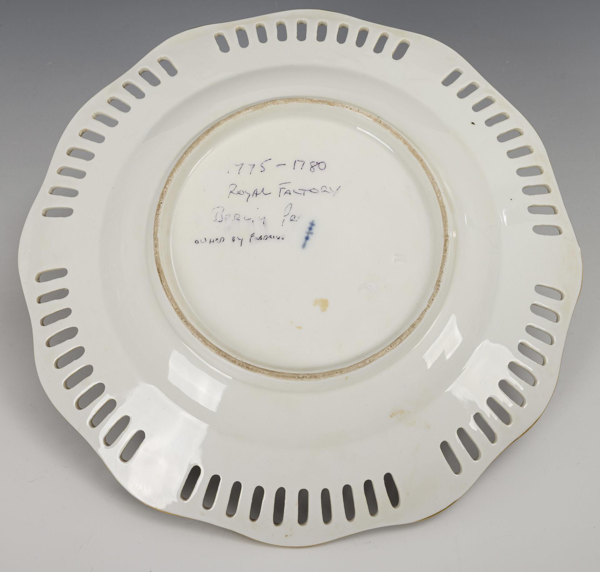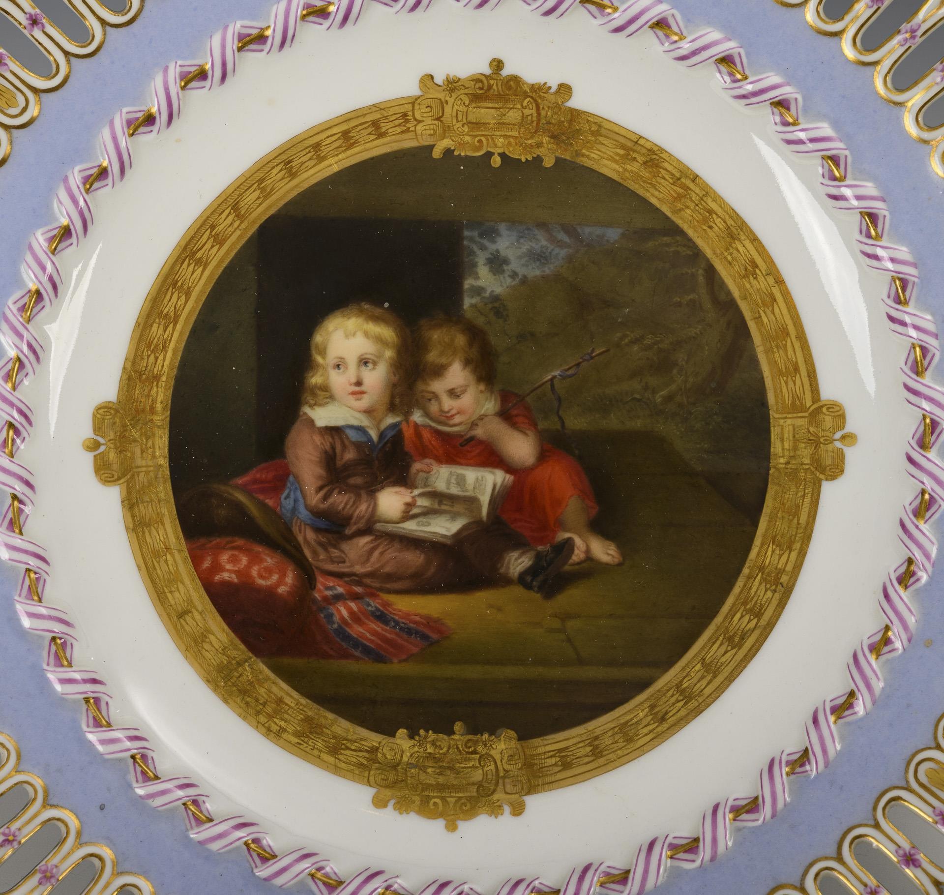 Multi-pass plate with openwork flag with light blue flag base. In the mirror a medallion set in a finely gold-engraved frame with the depiction of two children sitting on a sofa and leafing through a book, after a painting by Christian Leberecht Vogel (attributed, 1759-1816).