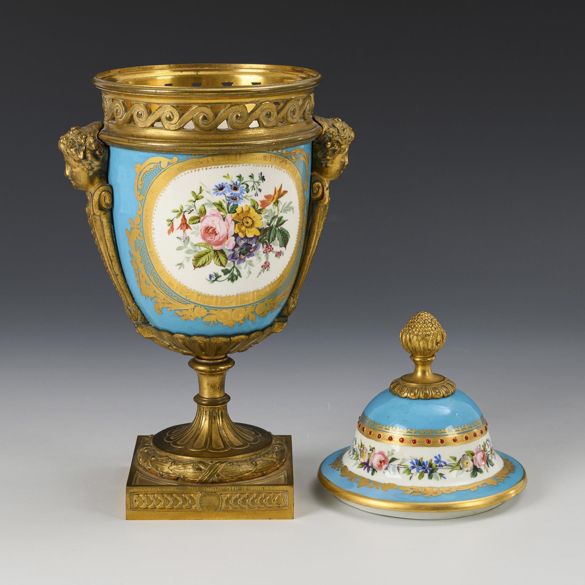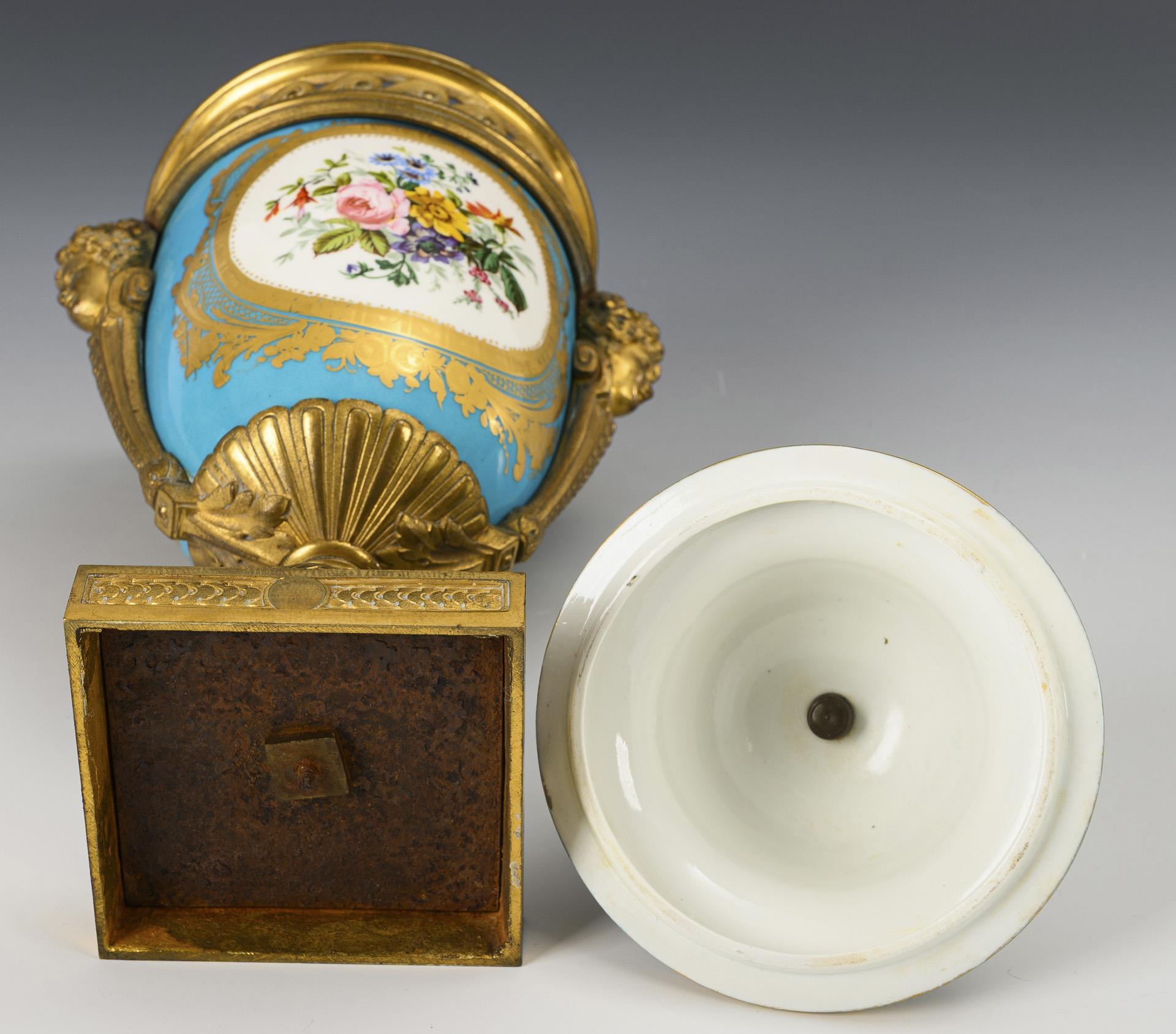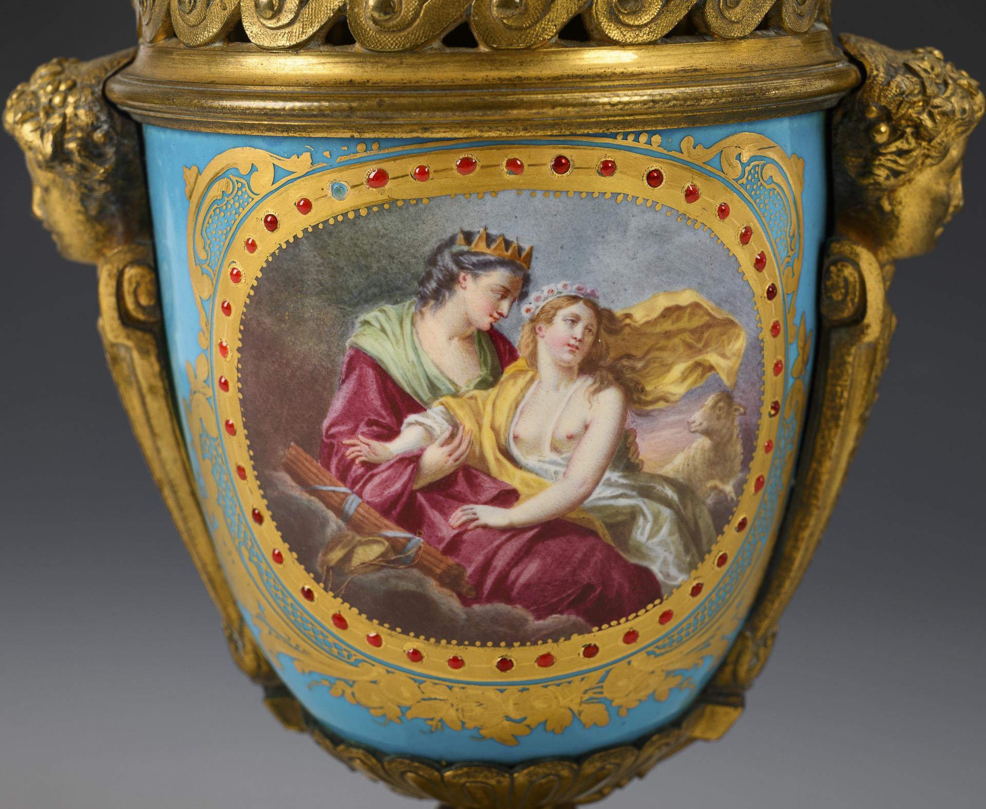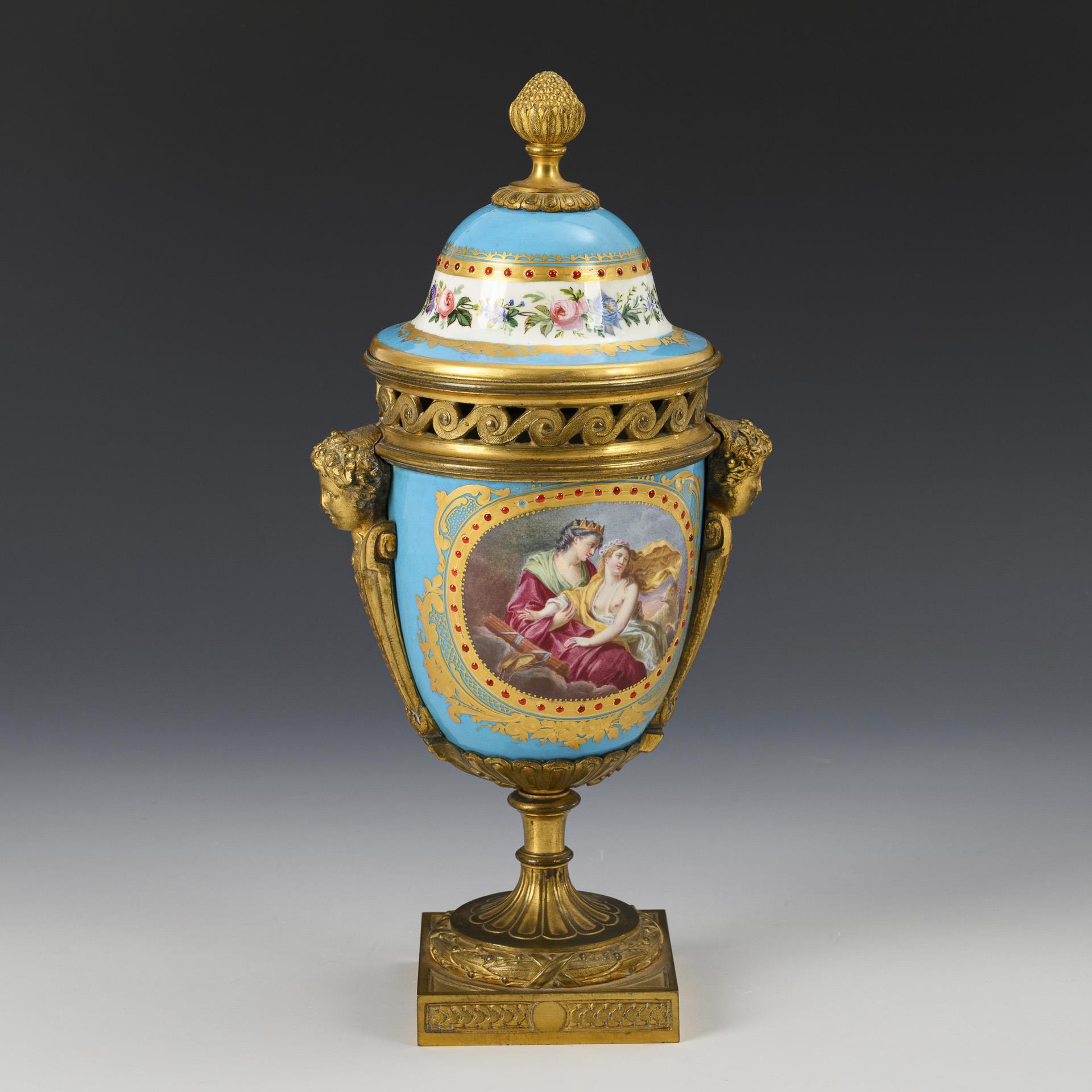 Ovoid body framed in a bronze mount with two female head handles, pierced meander rim and foot, lid with bronze knob. Turquoise background. A mythological depiction on the front, a bouquet of flowers on the reverse. Lid restored.