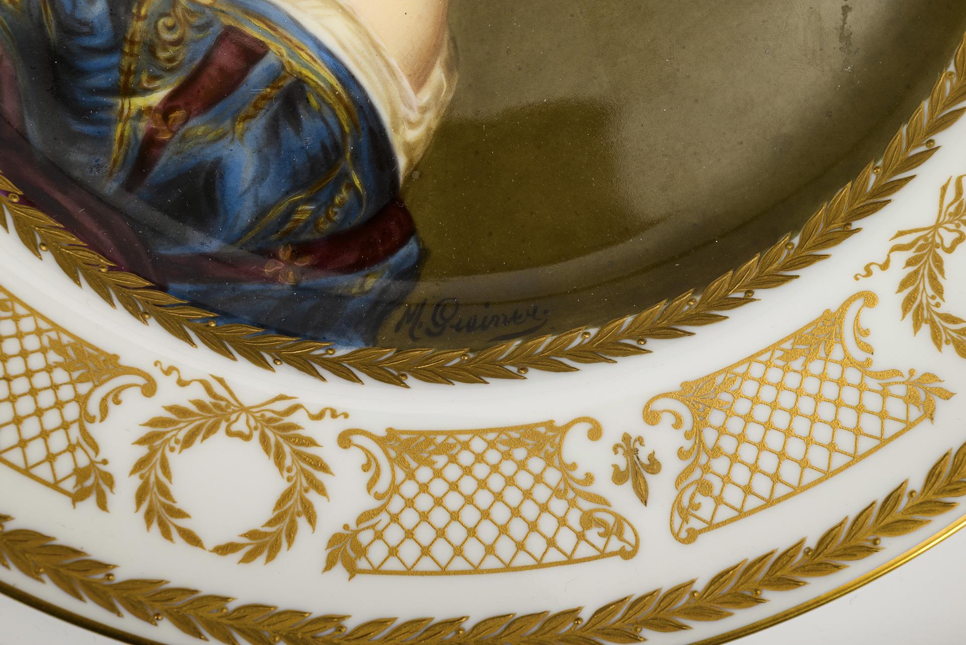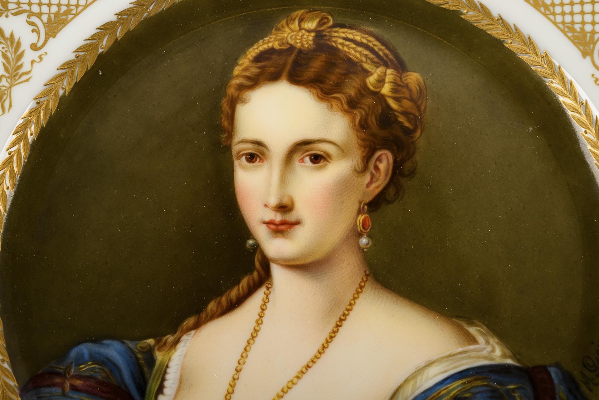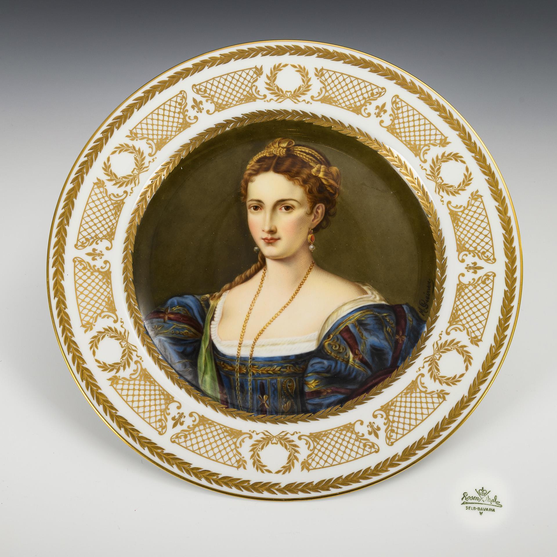 Flat plate with gold laurel and grillage decoration on the rim, in the mirror the portrait of a young Florentine woman.