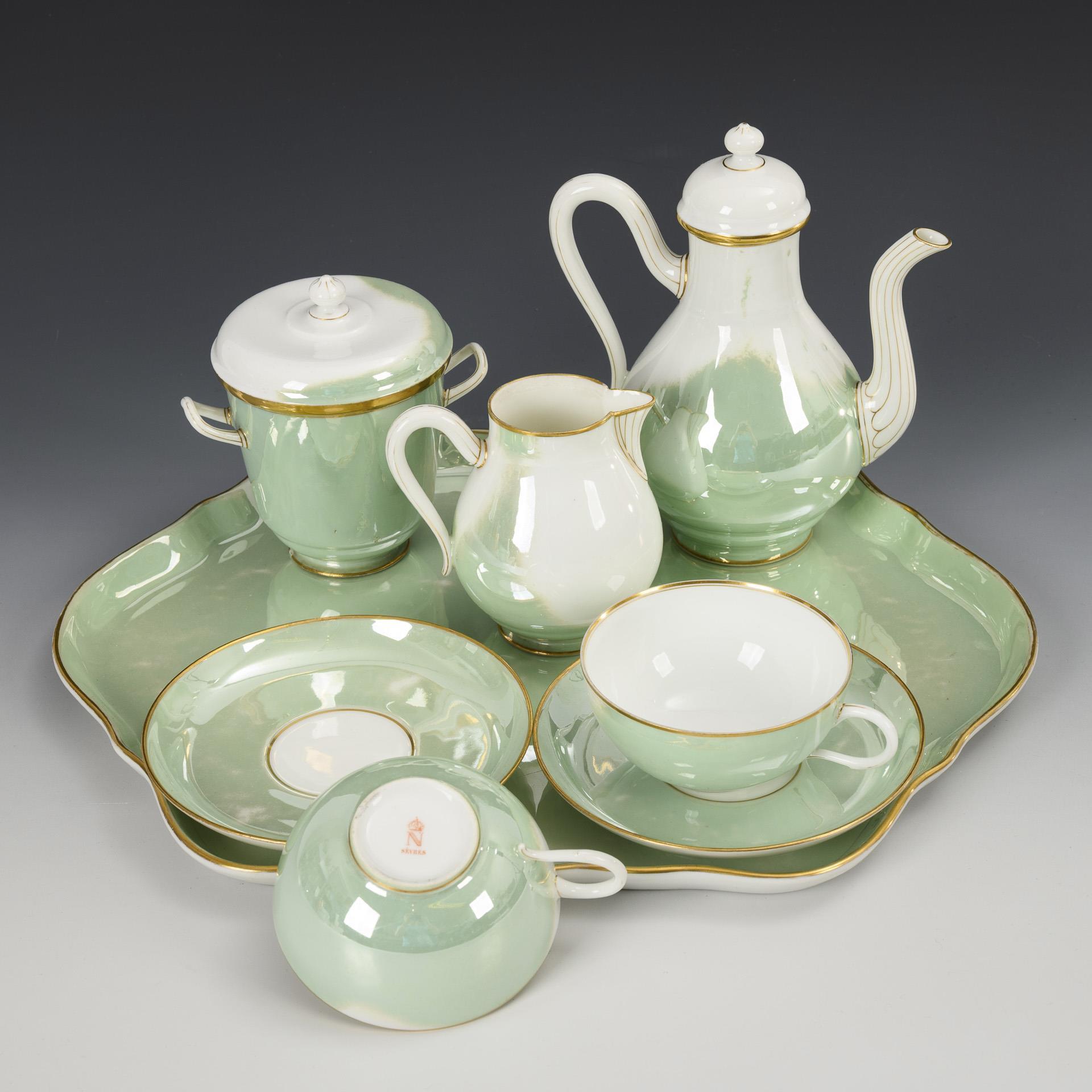 8 pieces. Jug (H 17.5 cm), milk jug (H 10 cm), sugar bowl (H 12 cm), 2 cups (H 4.5 cm), 2 saucers (Ø 13.5 cm) and 1 tray (L 37.5 cm). Small knock to the base of the handle of 1 cup, small knock to the stand of the sugar bowl, hairline crack to the sugar bowl.