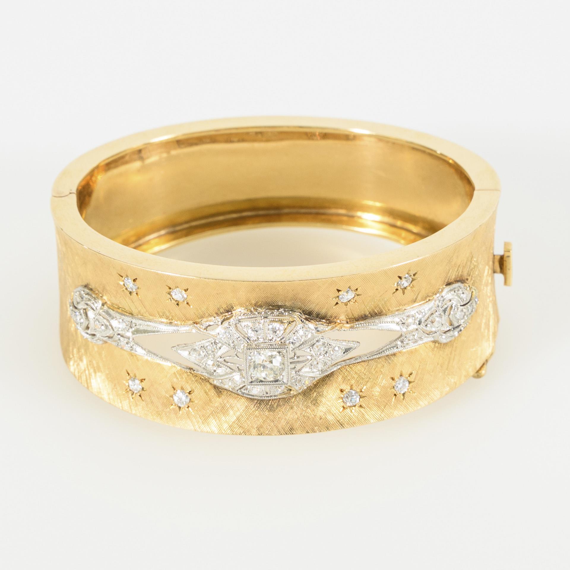 Exceptional, high-quality bangle in yellow gold, designed on the front with small diamonds and an element from an older, richly set piece of Art Deco jewelry with a central old-cut diamond, presumably a brooch. Unique jeweler's work. Slight signs of wear on the polished edges.