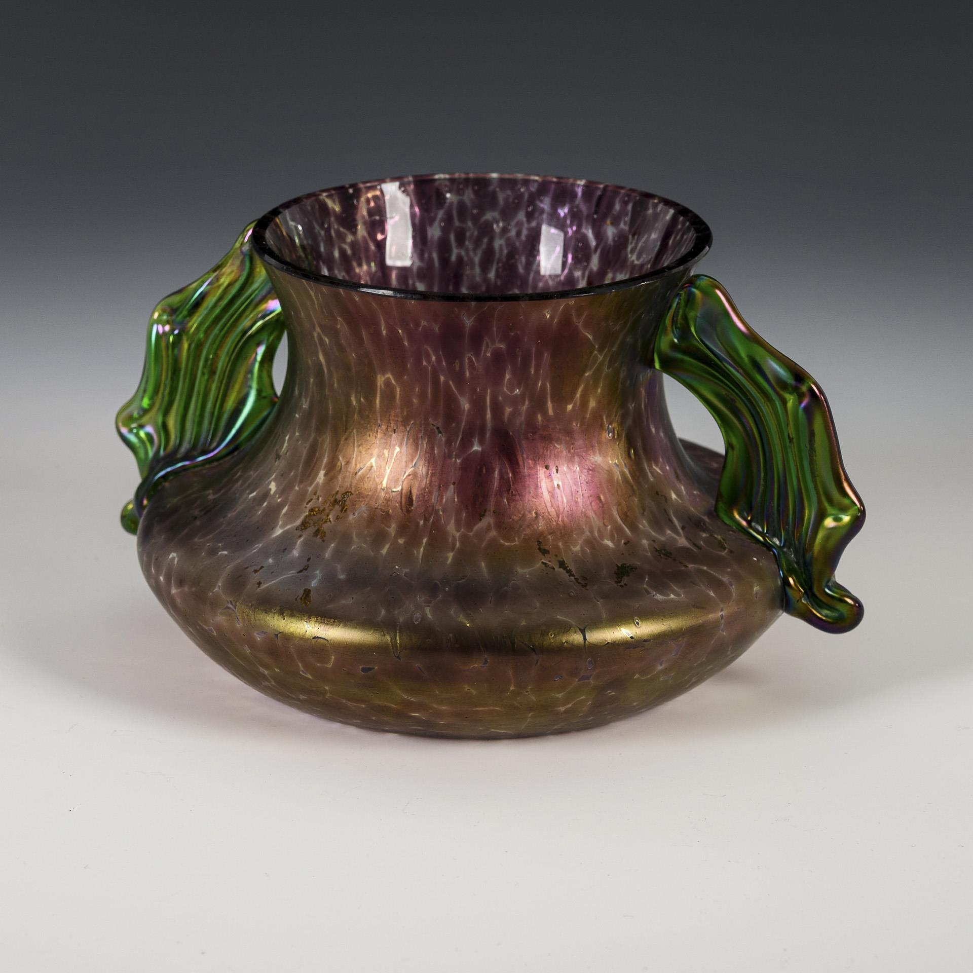 Colourless glass with purple crumbs, green glass, iridescent. H 9.5 cm. 460 g.