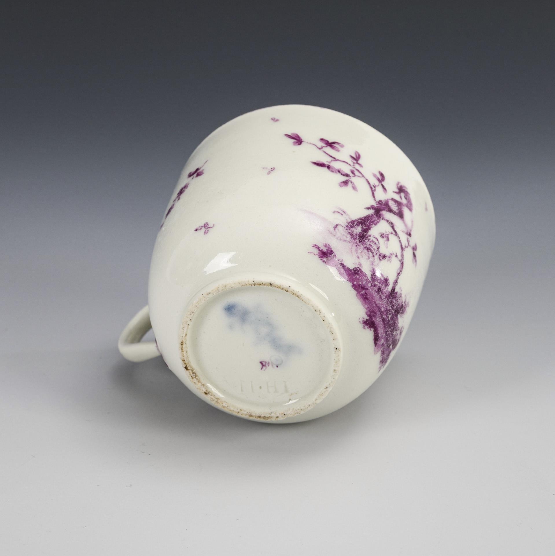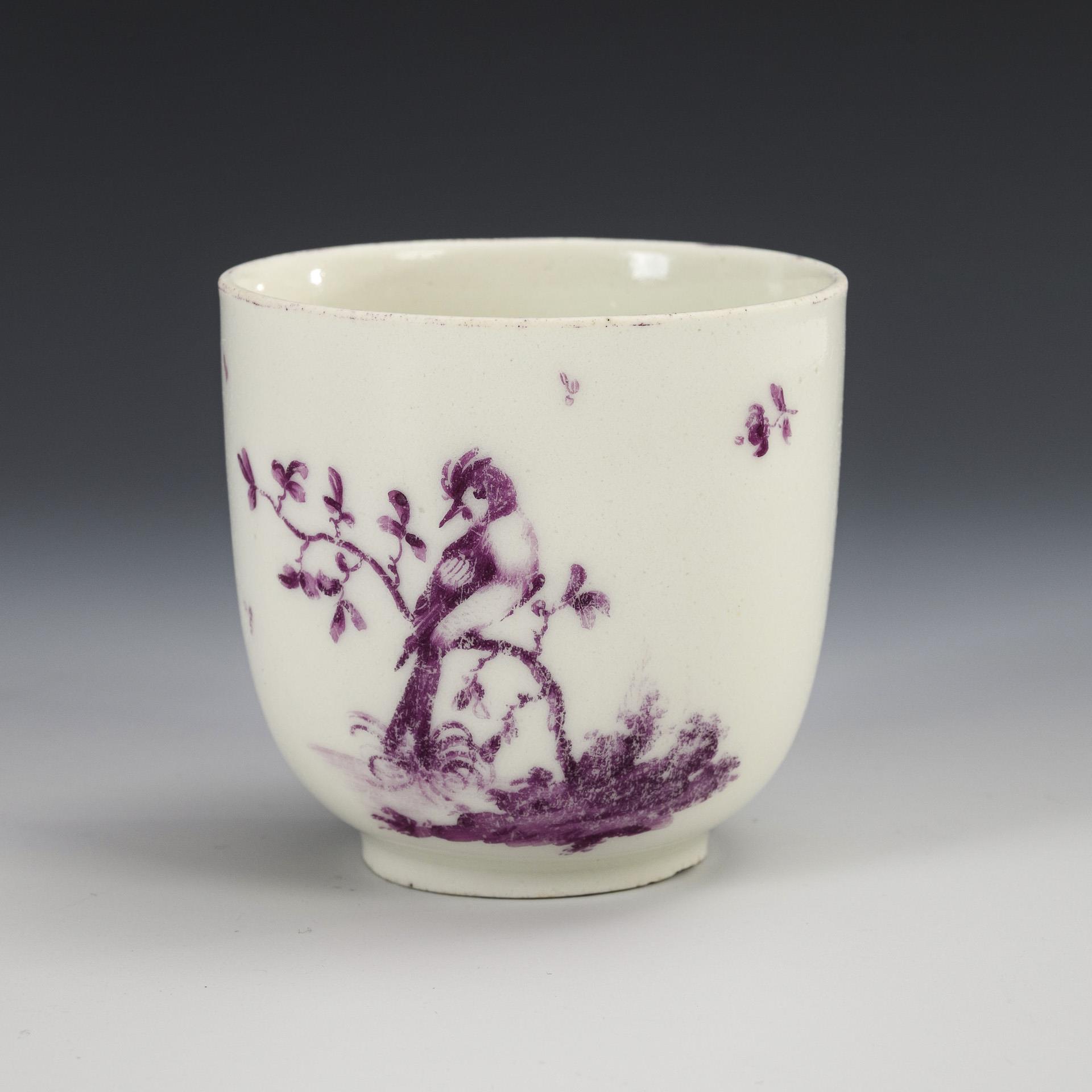 Depiction of a bird of paradise in a tree on the front. Without saucer. Brubbed, chips to the base ring.
