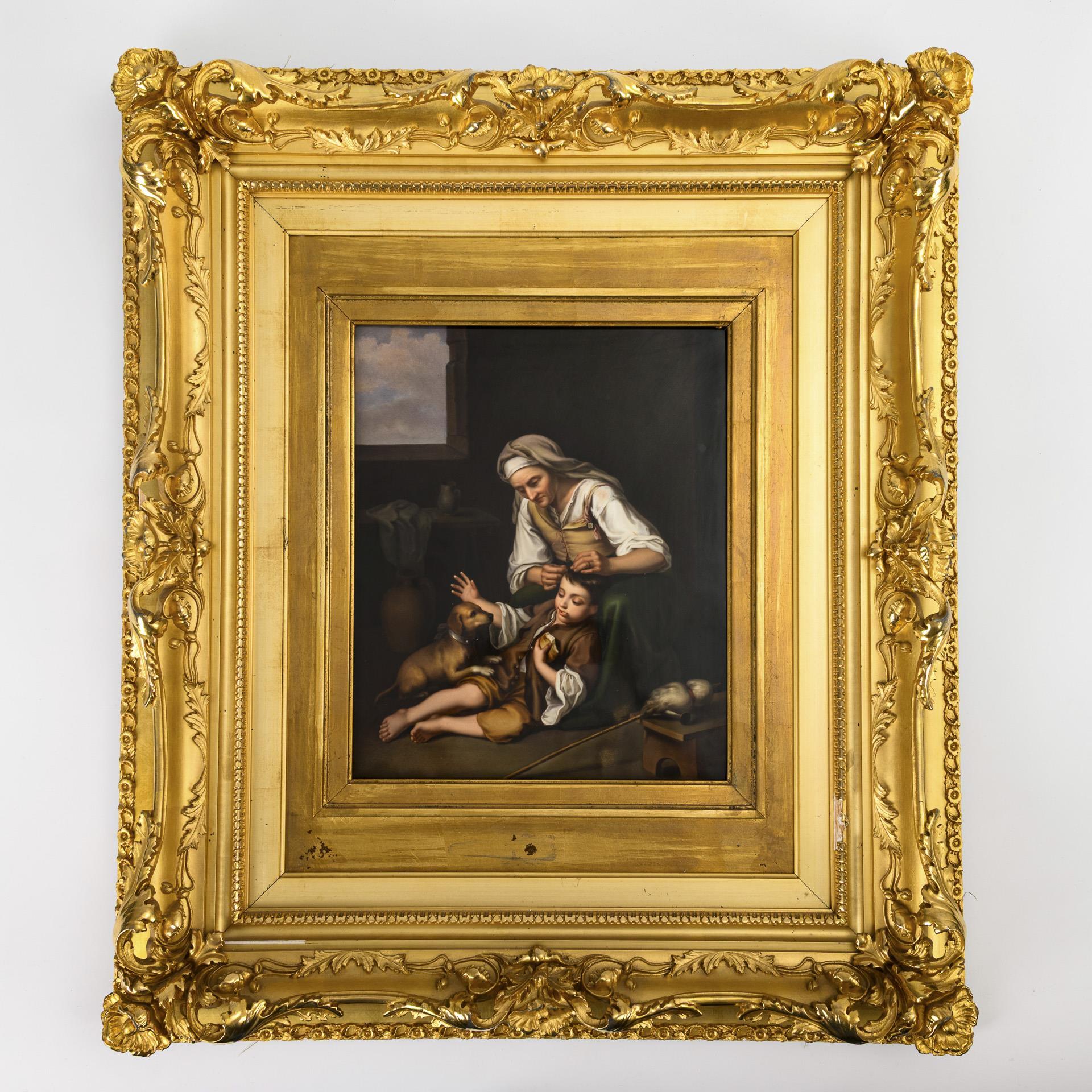 Porcelain painting: Old woman delousing a boy. KPM Berlin.
