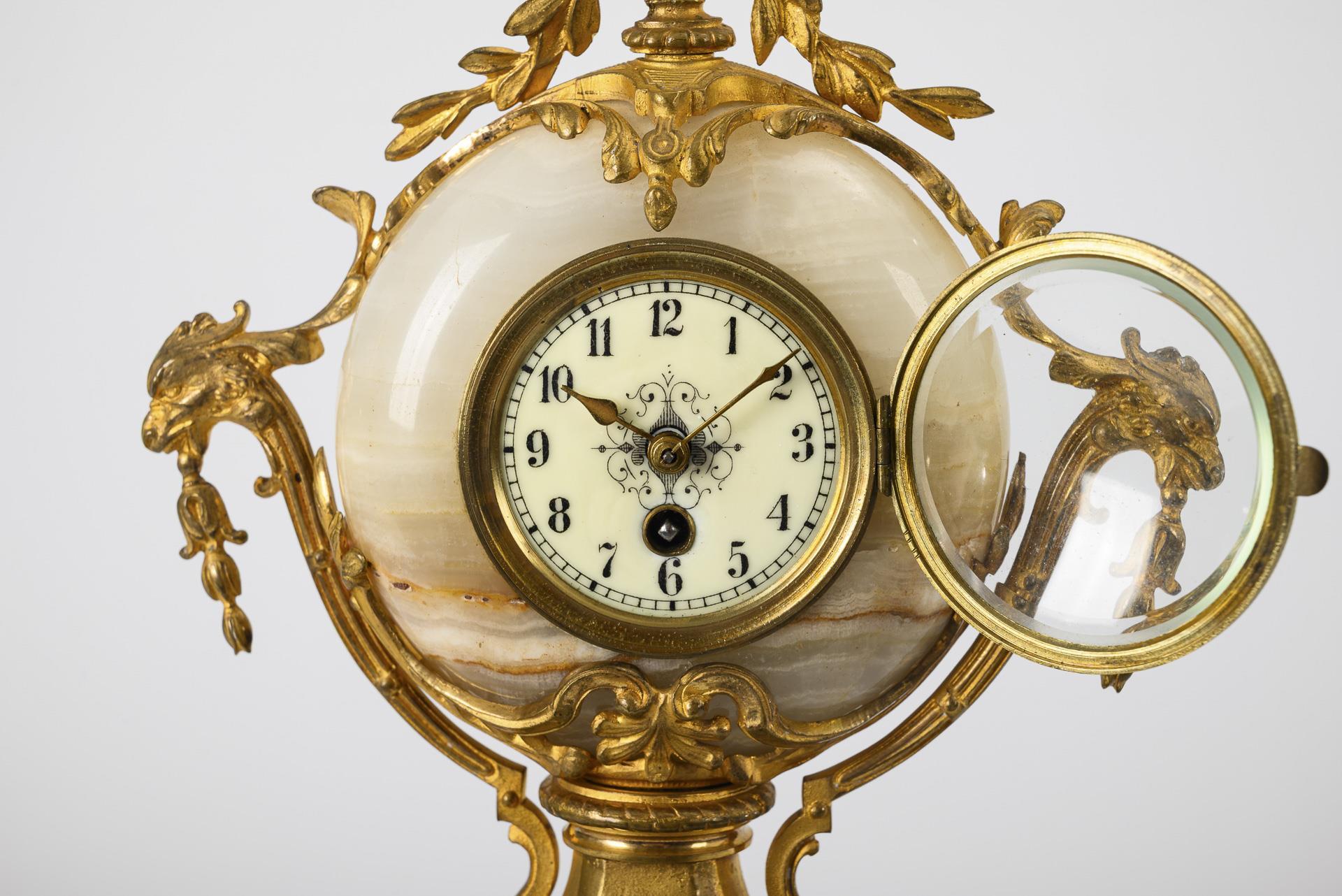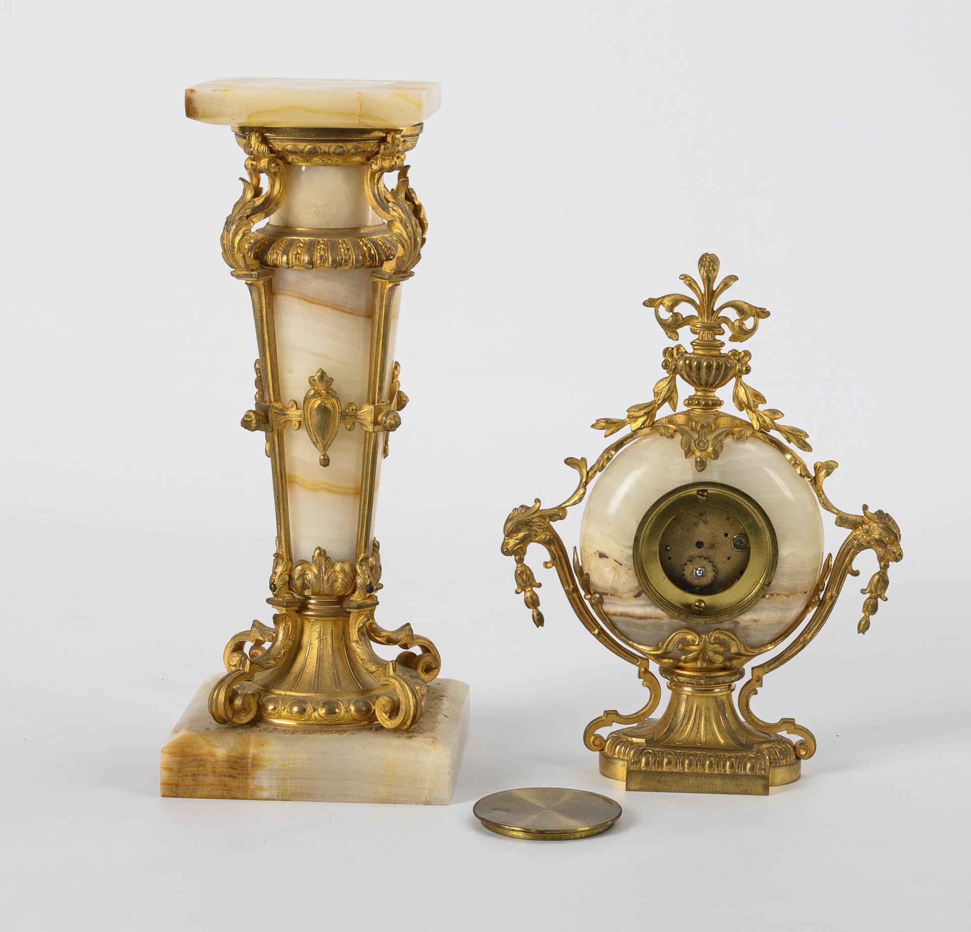 Gilt bronze, light onyx marble. Clock h 23 cm, column h 29.5 cm. Clock 1.2 kg, column 3.5 kg.