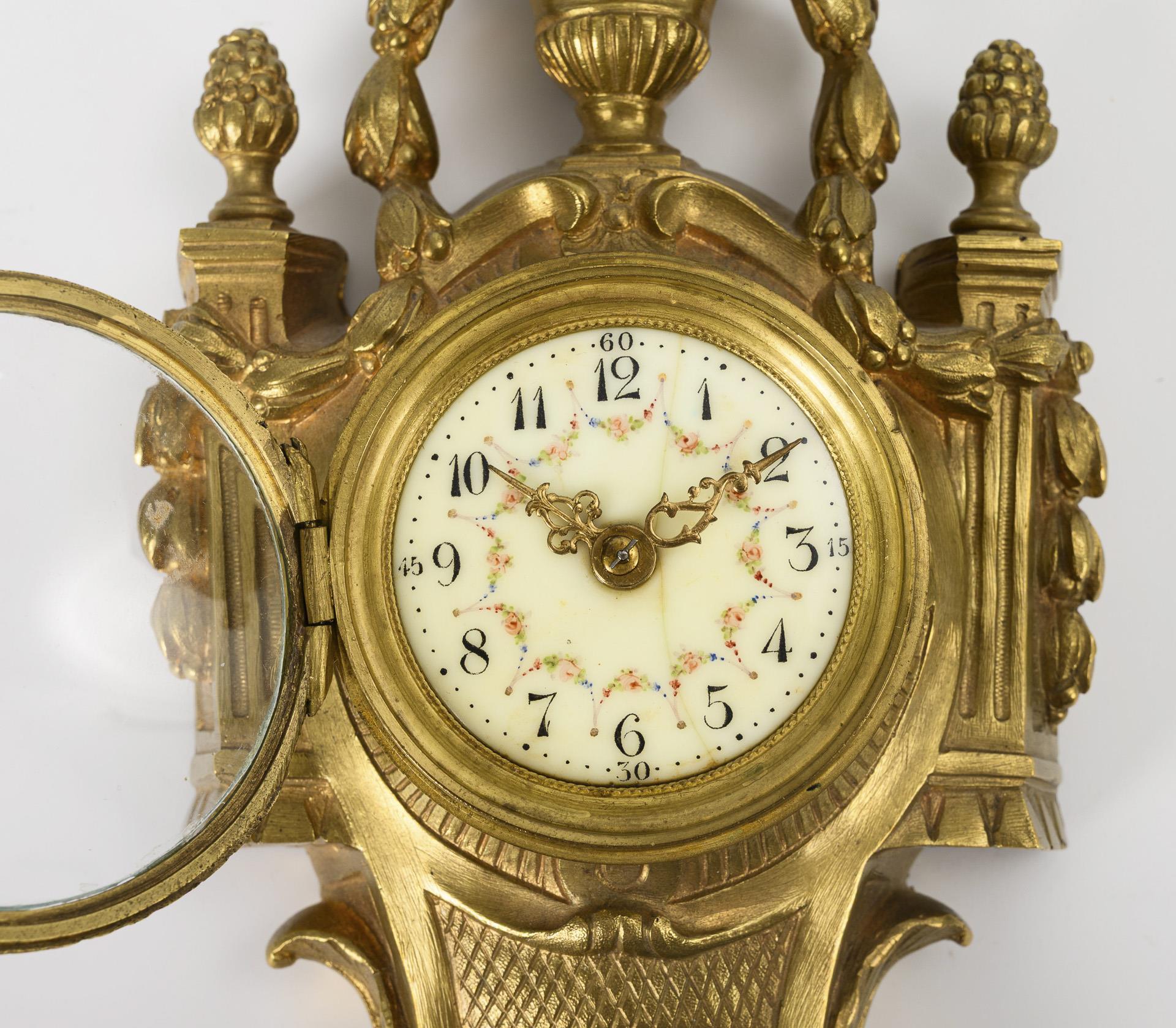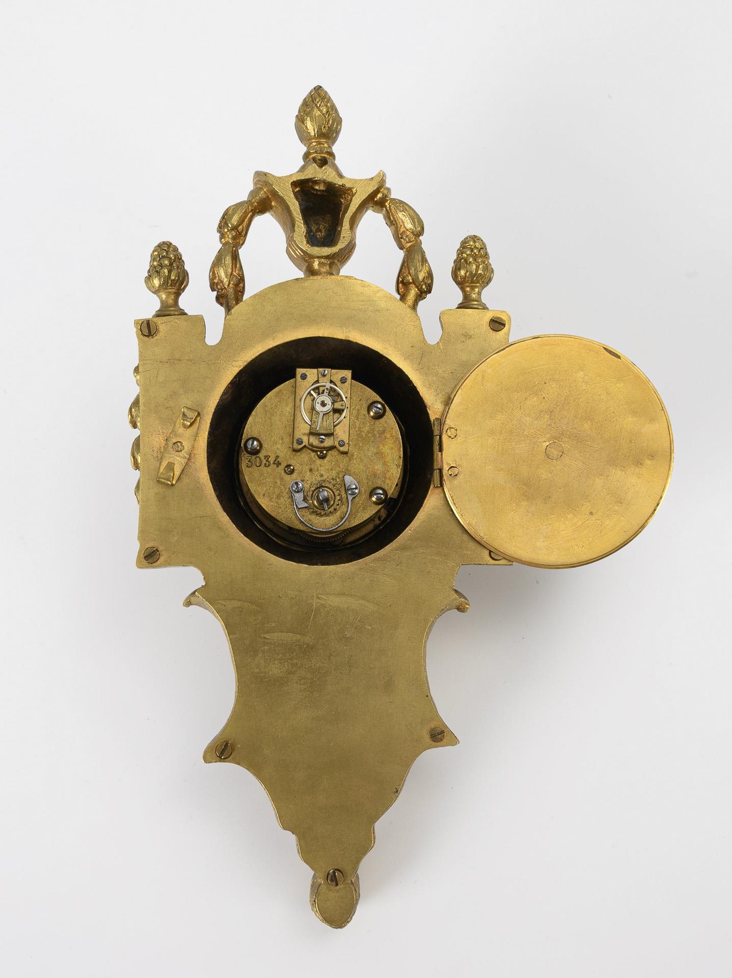 Neo-baroque wall clock case with classicist decoration and tenon finials. Dial with hairline cracks.