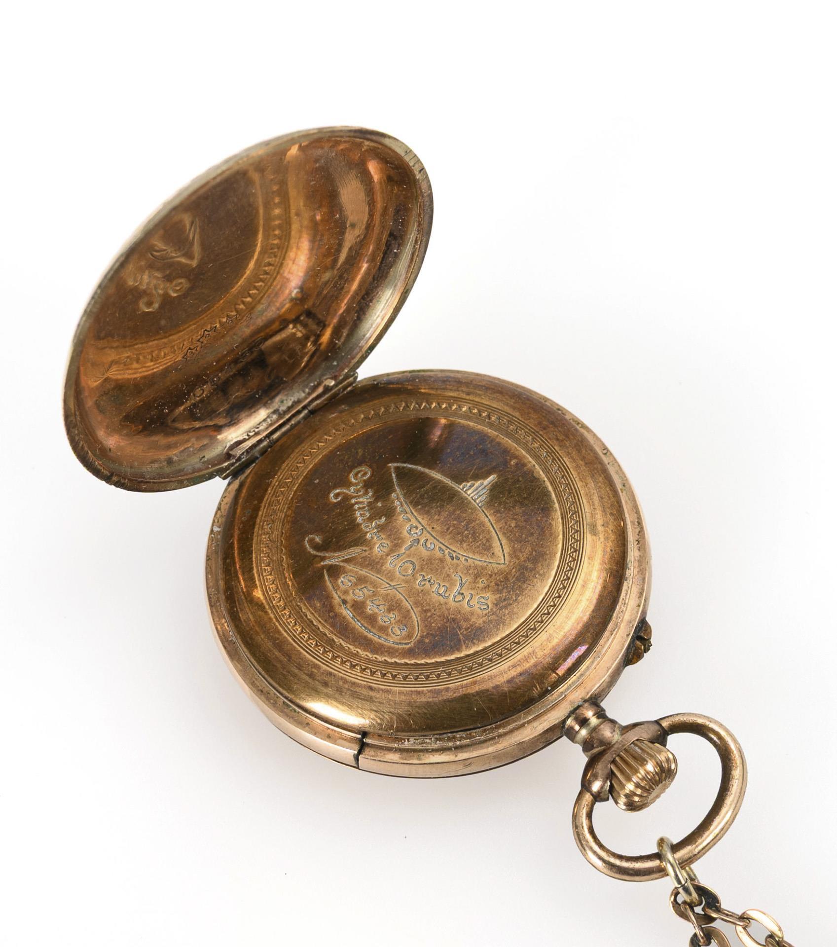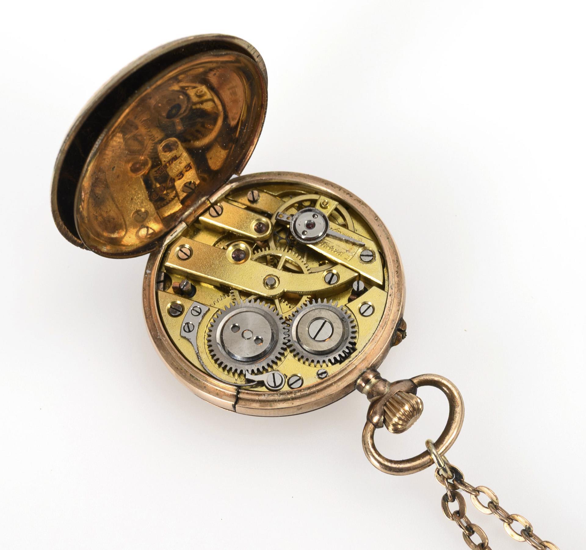 Fine chased, gilt lepine case with colored enamel flowers and empty coat of arms reserve. On a metal link chain with a small spring ring. Fine crack, small dents on the edge of the case, occasional losses to the enamel.