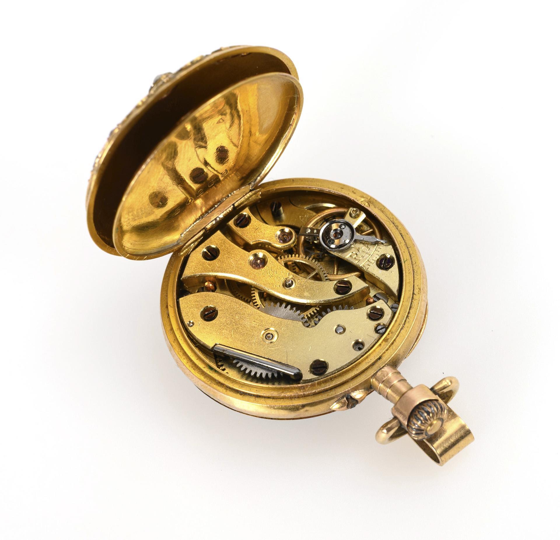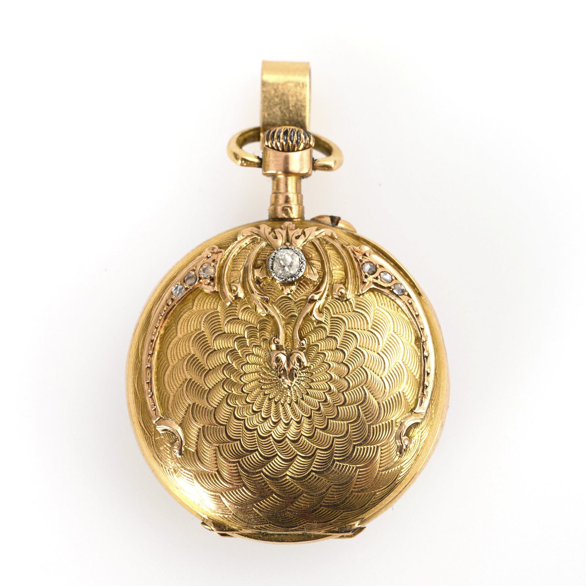 Artfully chased lepine case with 1 old-cut diamond and 6 diamond chips, set in a stylized overlay decoration. With pendant eyelet, without chain. Slight signs of age and wear.