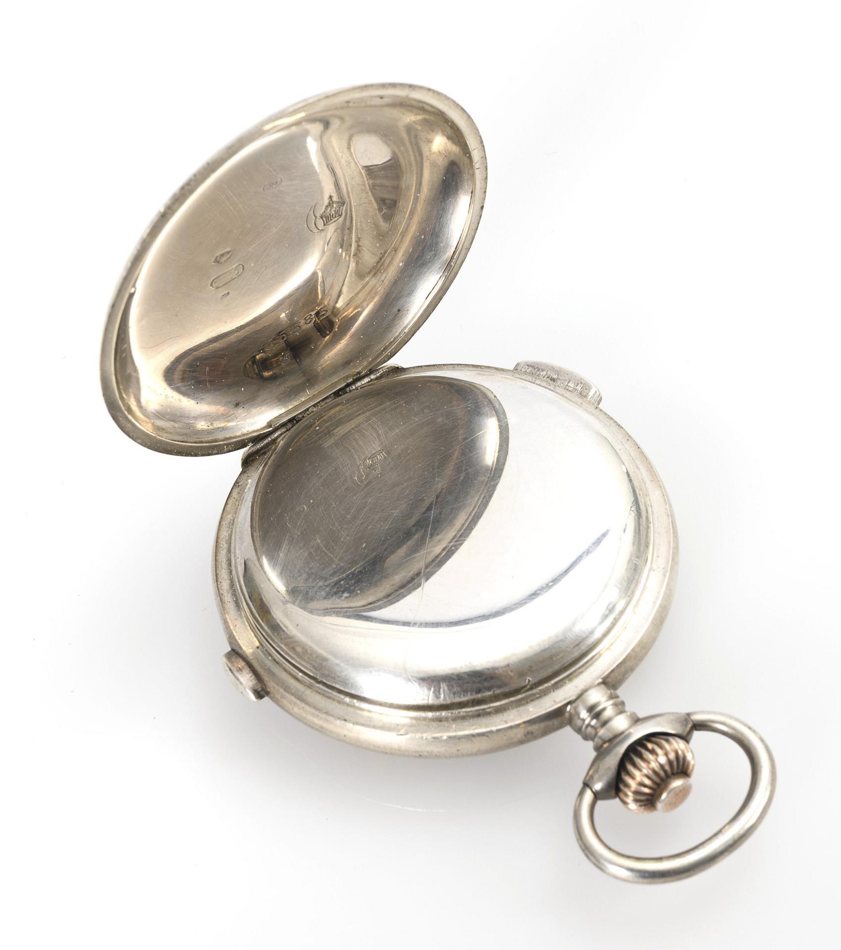 Marked movement with lever escapement, screw balance, jewels, crown winding, hour and quarter hour strike on 2 gongs. Functional in short time test. White enamel dial with Arabic numerals, minute ring, small second and Louis XV hands, central second for stopwatch function.