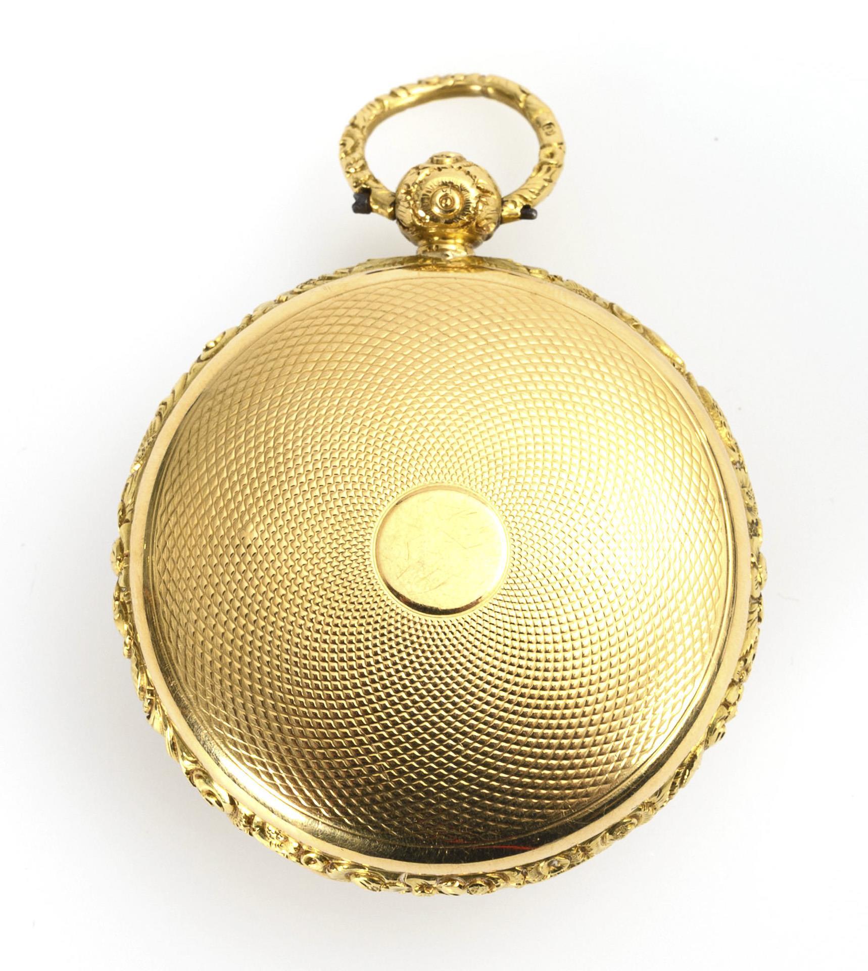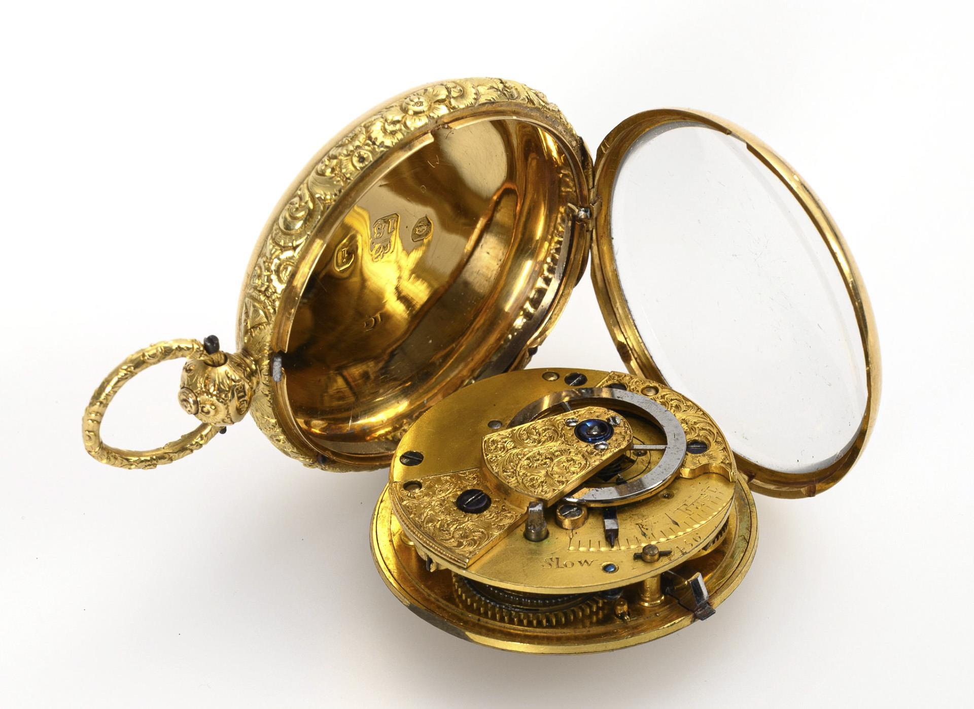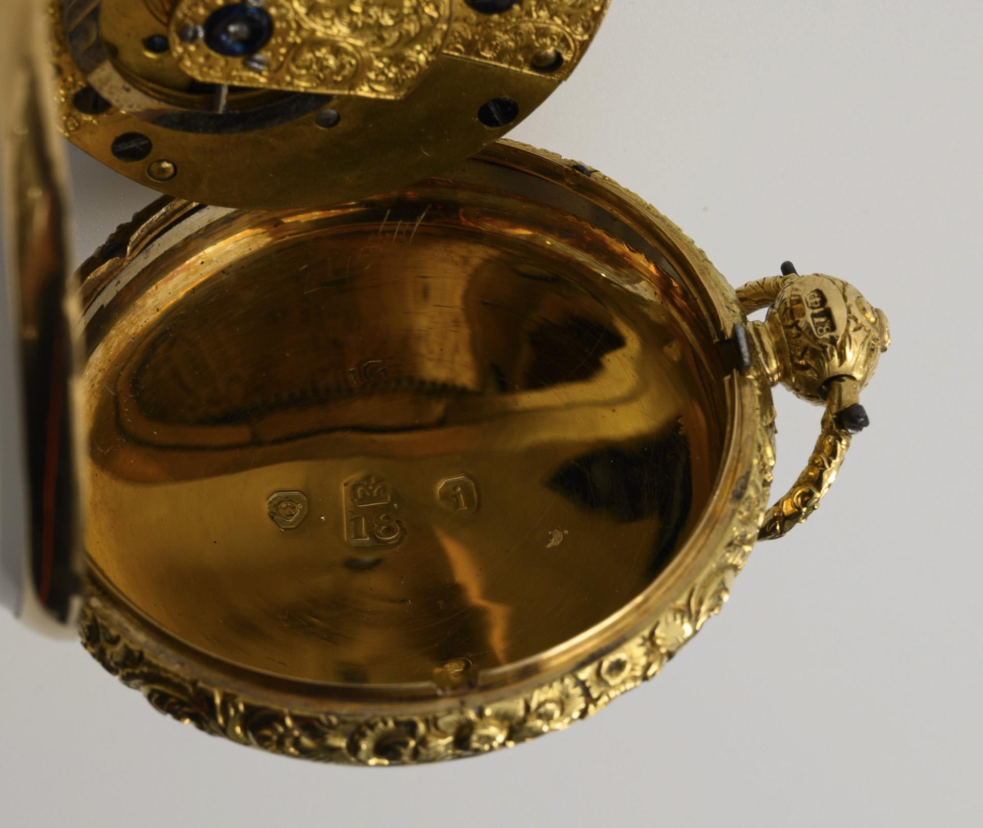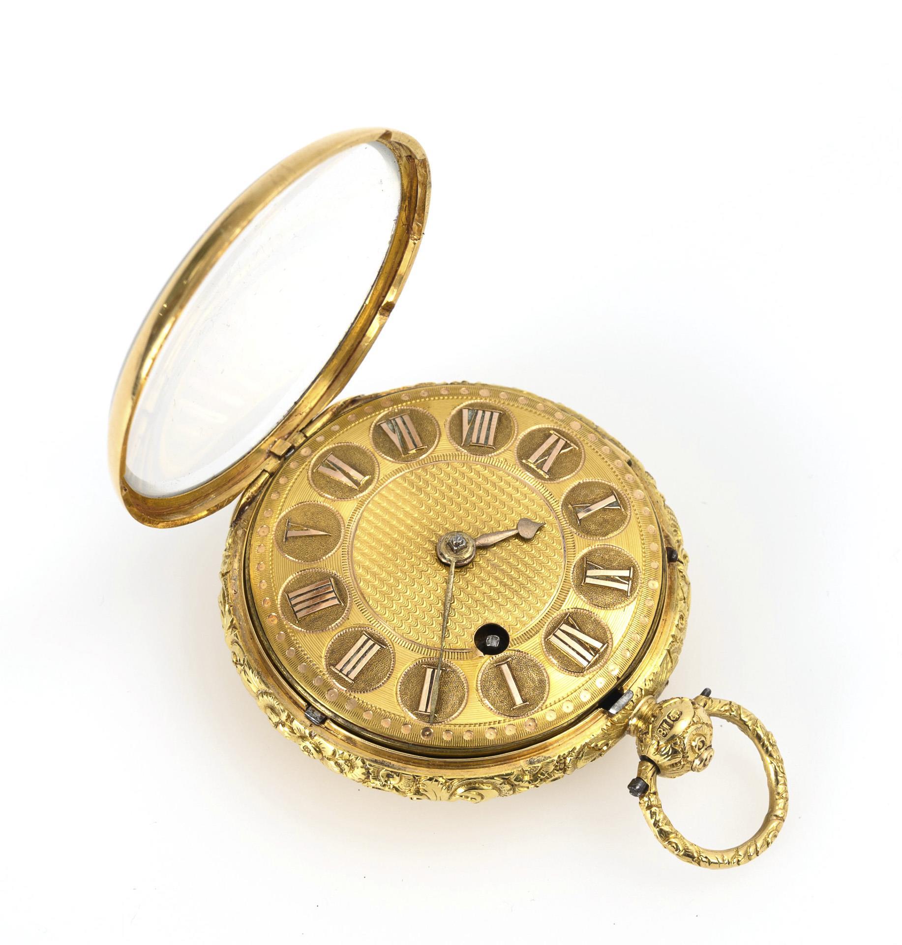 Unmarked full plate movement with floral engravings, verge escapement, chain and fusee, keywind. Short running. Gold dial in relief with Roman numerals, minute ring and brass hands.