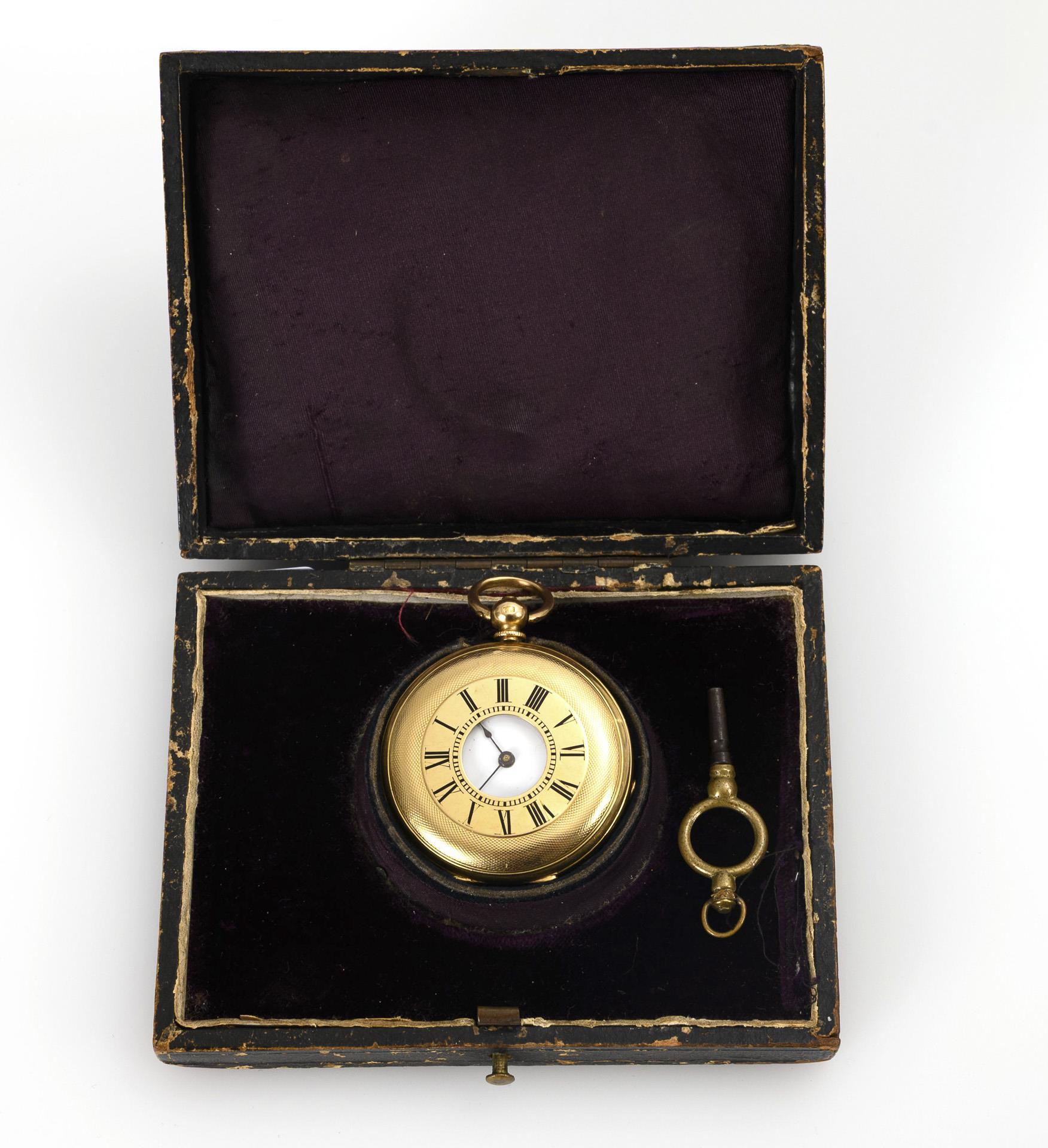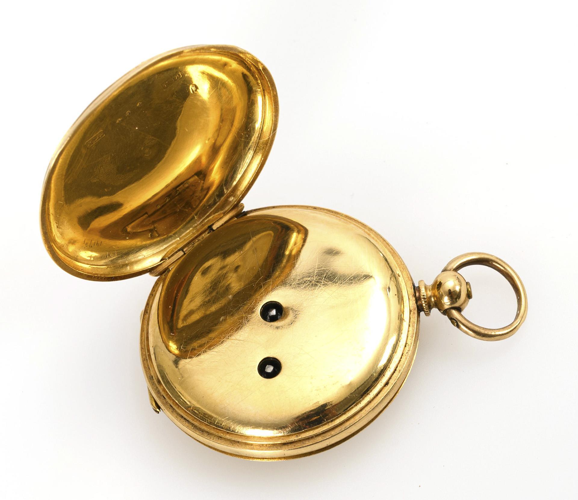 18 k hallmarked, with official hallmark for 750 gold from 1819 to 1865, company mark, gold dust cover. Ø 3.8 cm. 36 g.