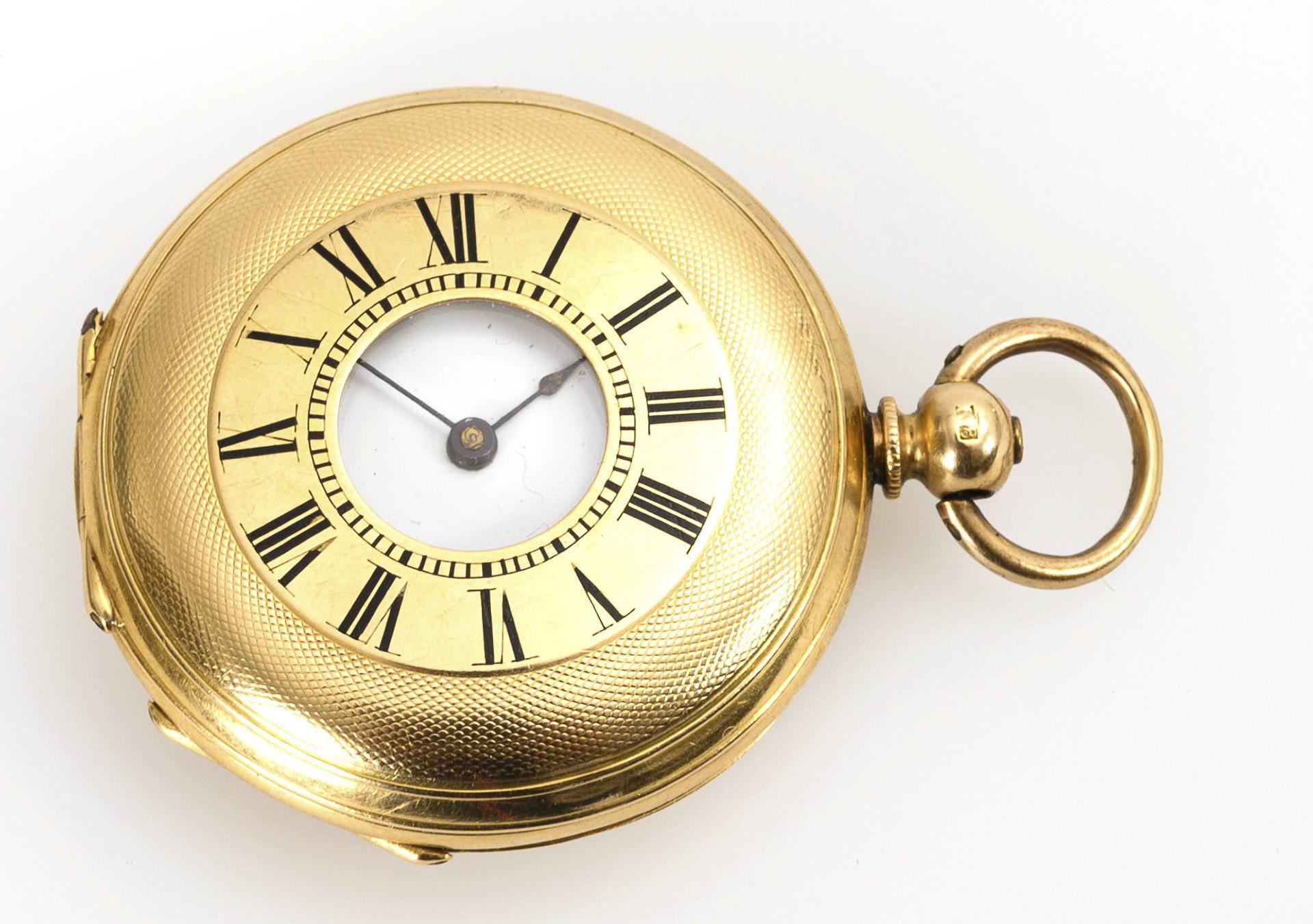 Guilloched sprung lid case with black enameled outer chapter ring, on the back an empty round reserve. Slight signs of age and wear.