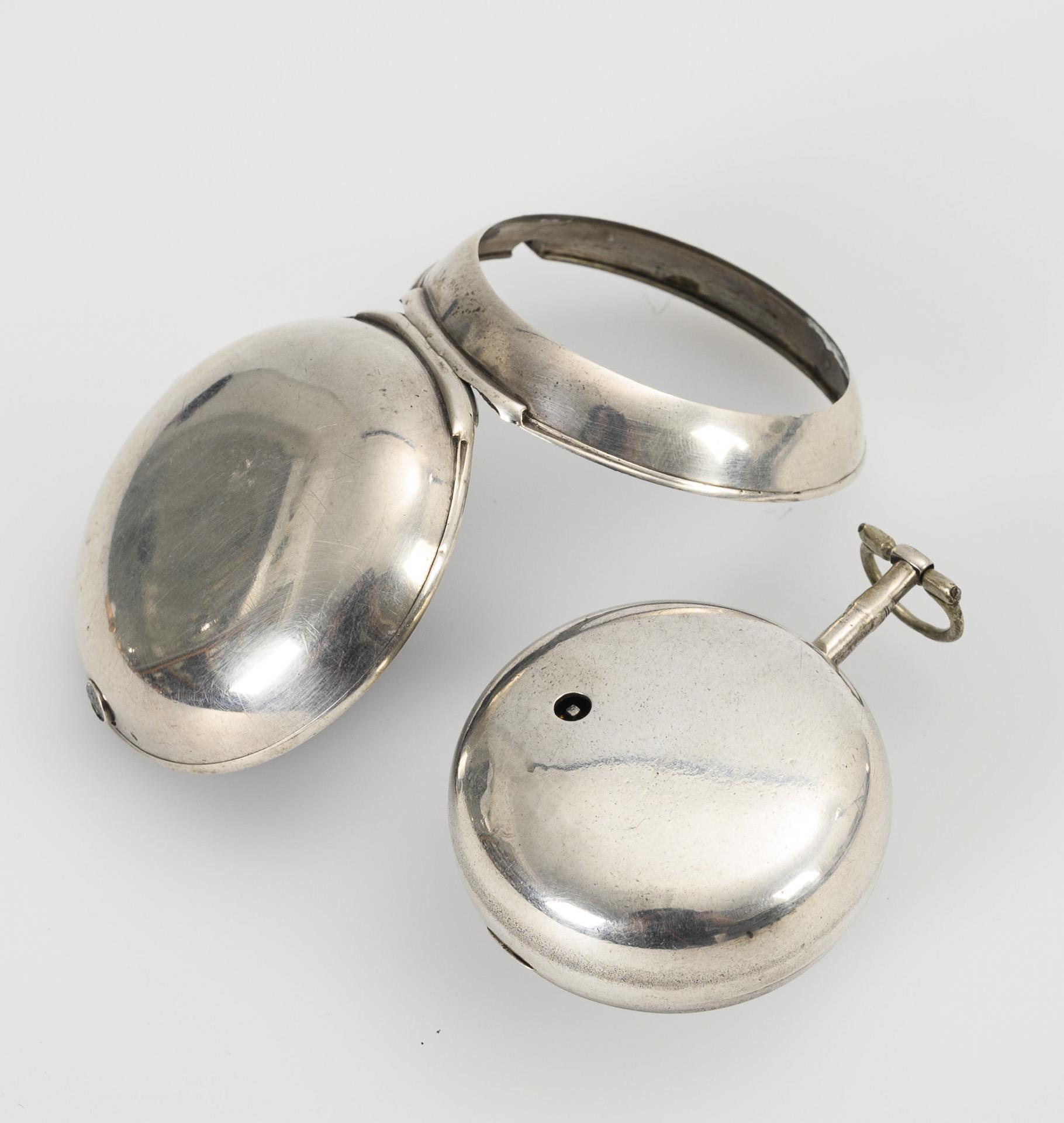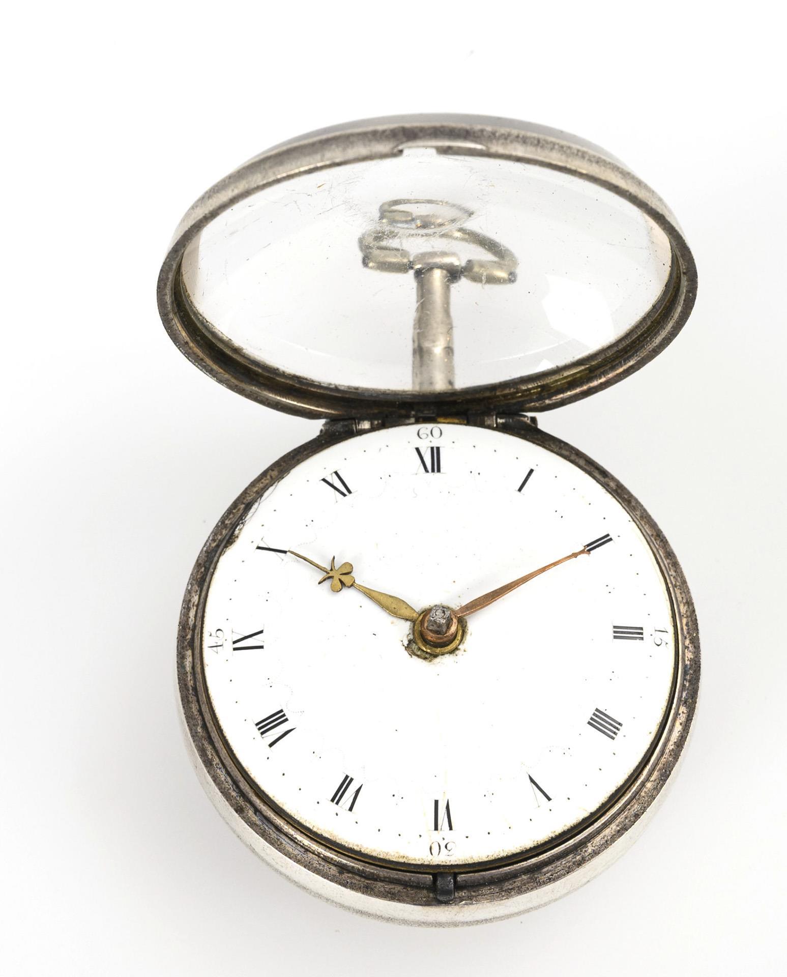 Strolling lion/city mark Birmingham/year letter T (1791)/master's mark and customs mark King George III (1786-1821) hallmarked. Clock Ø 4.3 cm, mantle Ø 5.3 cm. Total weight 130 g.