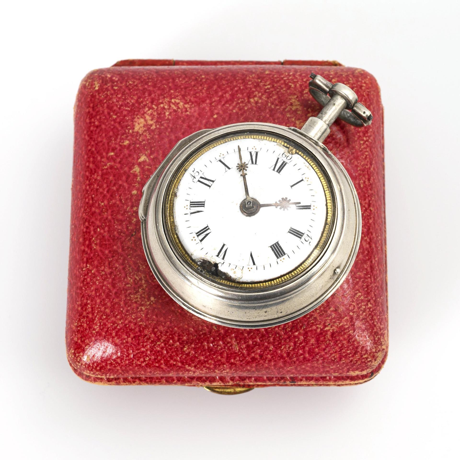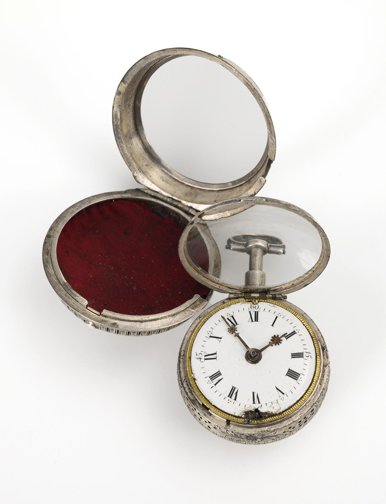 Smooth case with florally engraved rim and high bar as pusher, in a smooth silver watch case. Slight signs of age and wear, defects.