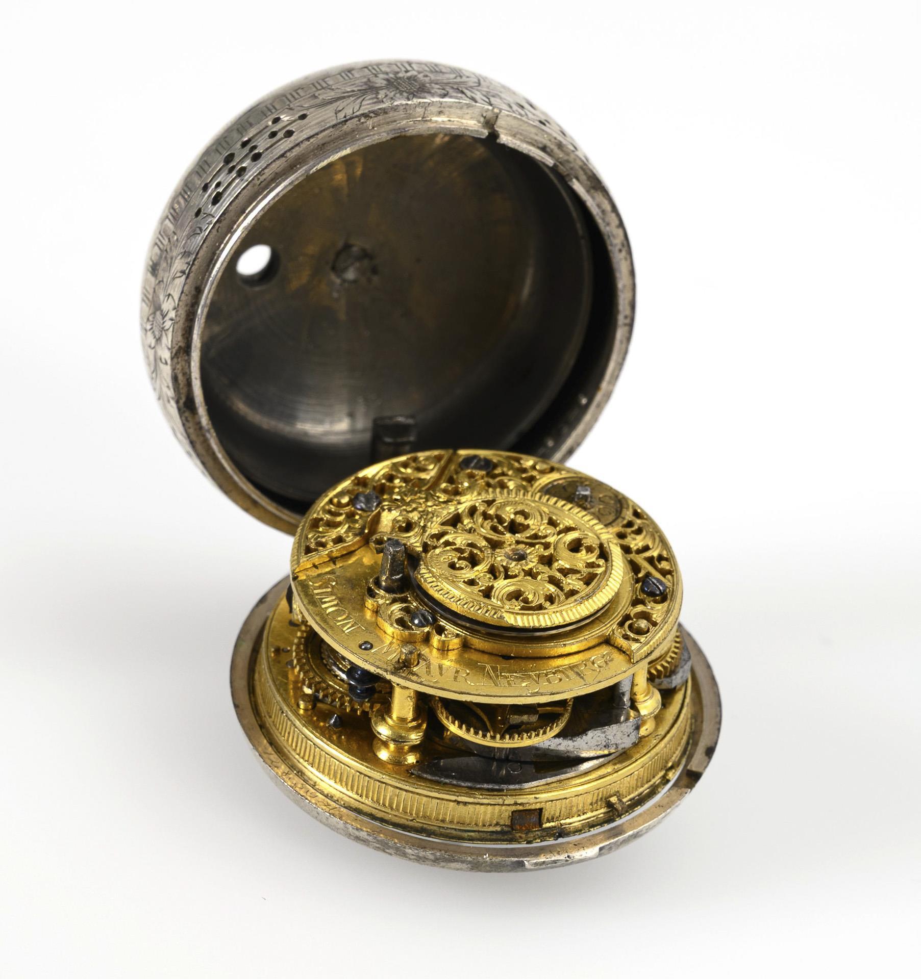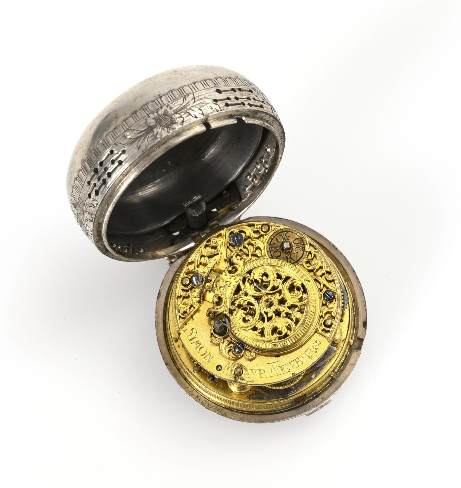 "Simon Mayr Neyburg" signed brass full plate movement with magnificent floral overlays and florally pierced verge bridge with mascaron, profiled movement pillars, verge escapement, chain and fusee, hour and quarter hour strike on bell, keywind. Functional in short time test. White enamel dial with Roman and Arabic numerals, minute ring and brass sun hands.