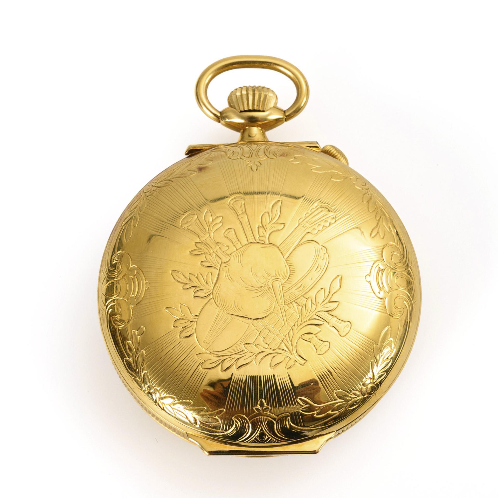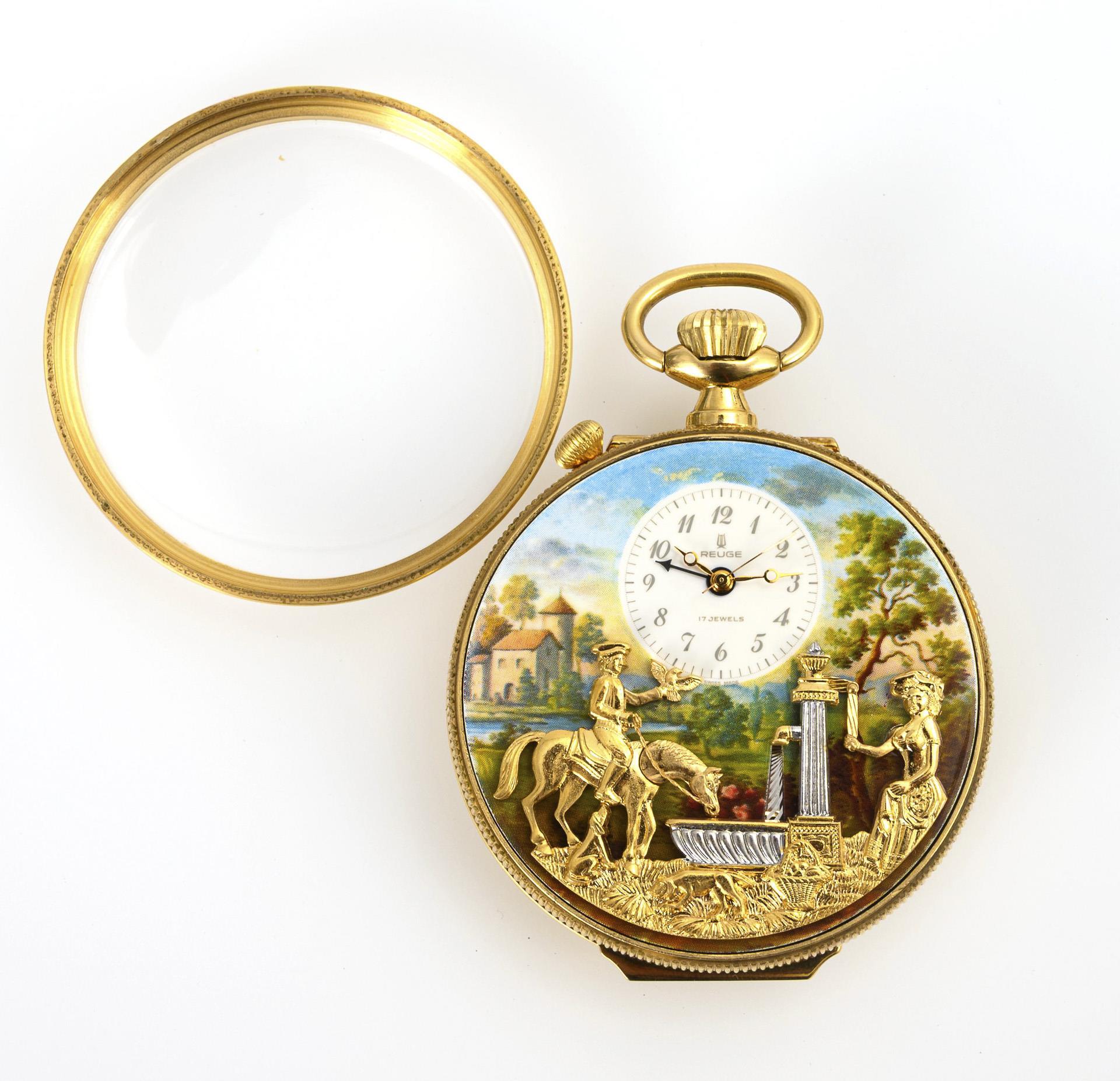 Market Swiss Pontifa SA. precision movement with crown winder, musical movement with separate pusher and key winder, alarm movement with separate crown winder at 11. Functional in the short-term test, overhaul recommended. Color-printed enamel dial with a landscape and architecture, the lower section with an applied, movable group of figures with a woman at a fountain and a rider with a bird and dog, the upper section with a small white enamel dial with Arabic numerals, minute ring and pierced hands, central second hand and an arrowhead hand for the alarm.