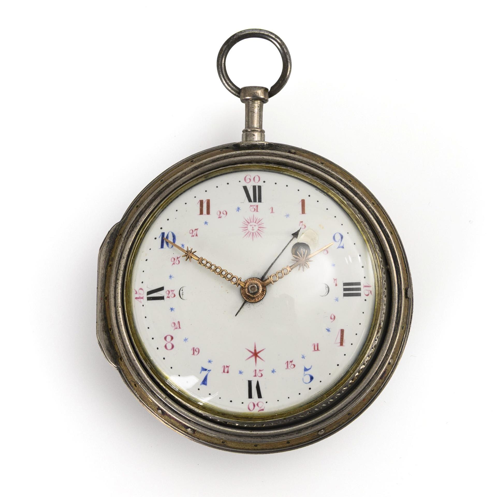 "Berthoud à Paris" signed brass full plate movement with florally pierced verge bridge, profiled movement pillars, verge escapement, chain and fusee, keywind. Functional in short time test. White enamel dial with colored Roman and Arabic numerals, minute ring and sun and arrowhead hands, inner chapter ring for date with moon phase motifs.