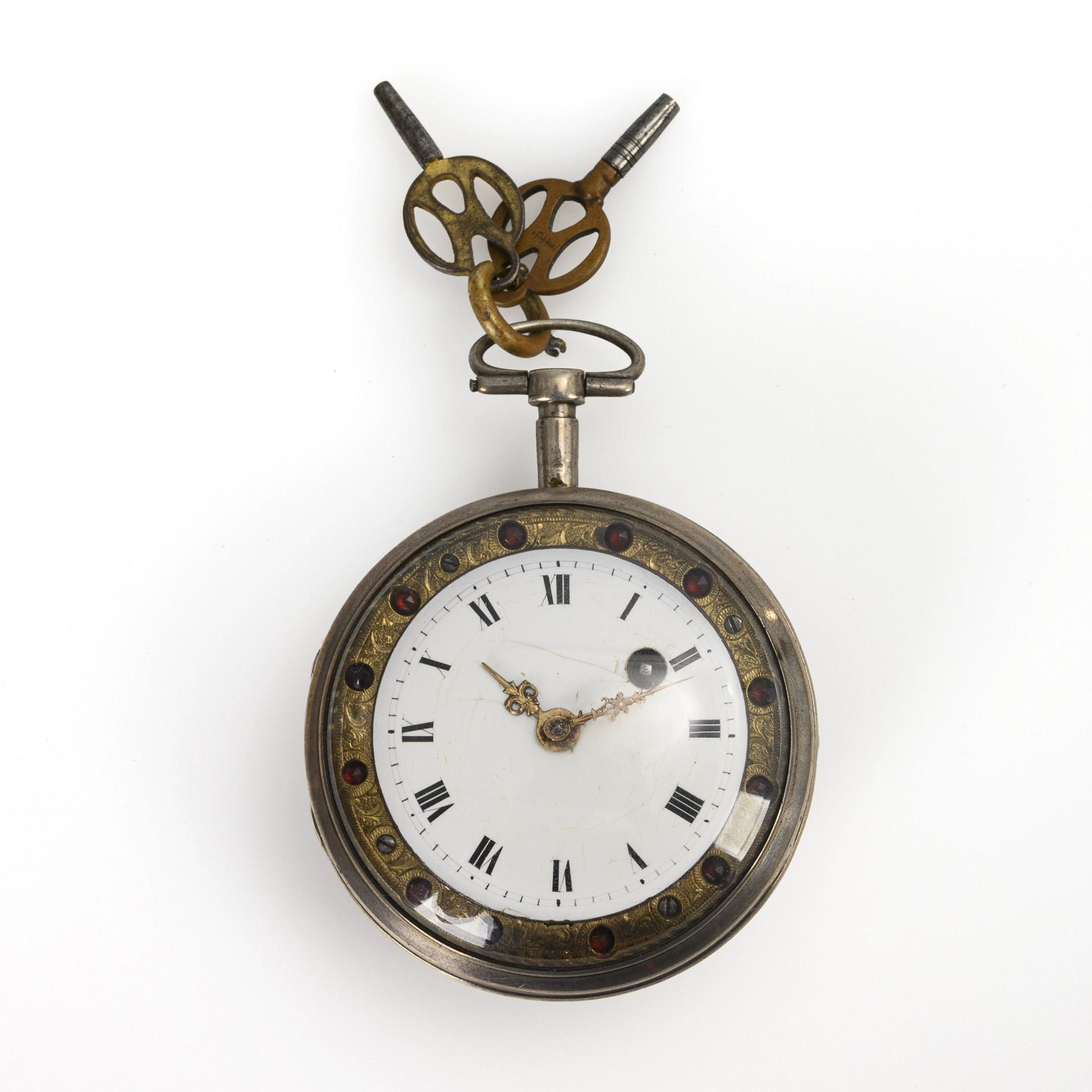 Smooth case with stone-set and florally chased brass bezel. Slight signs of age and wear, slight defects, replaced minute hand.