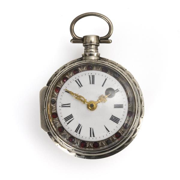 Unmarked, silver tested. Ø 4.8 cm, watch case Ø 5.5 cm. 88 g.