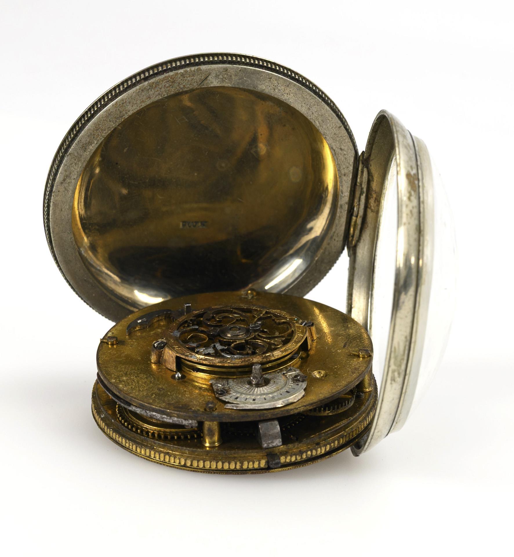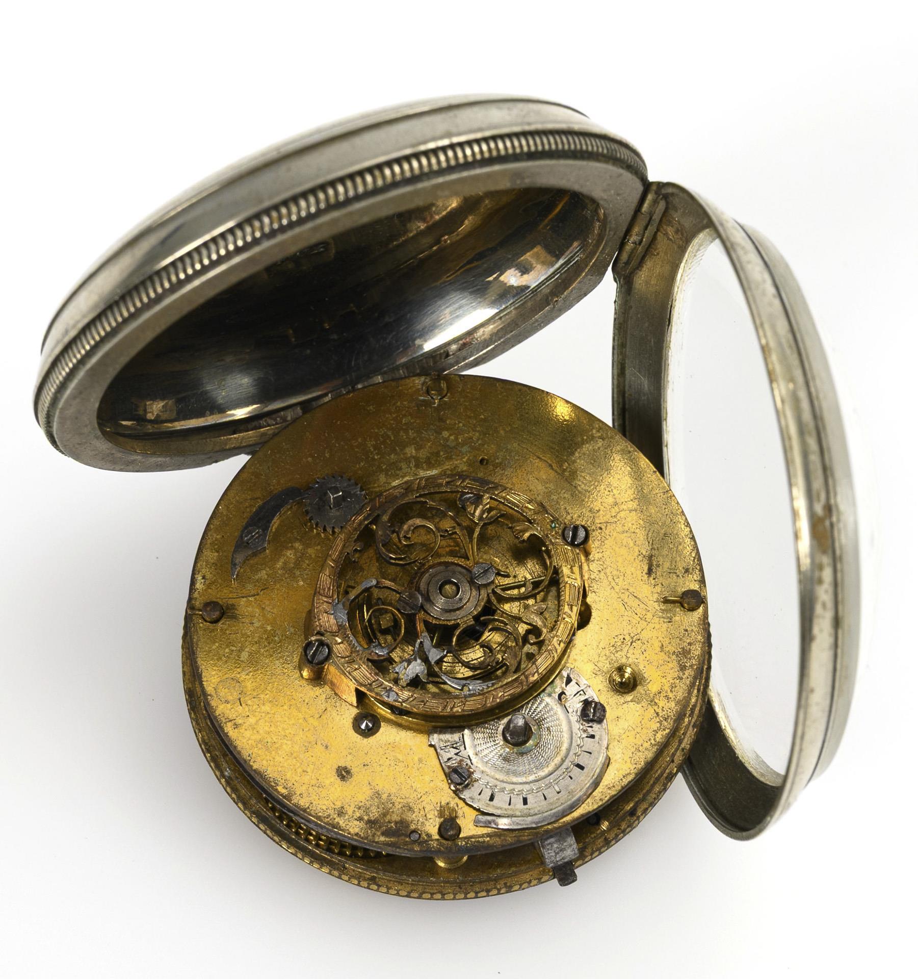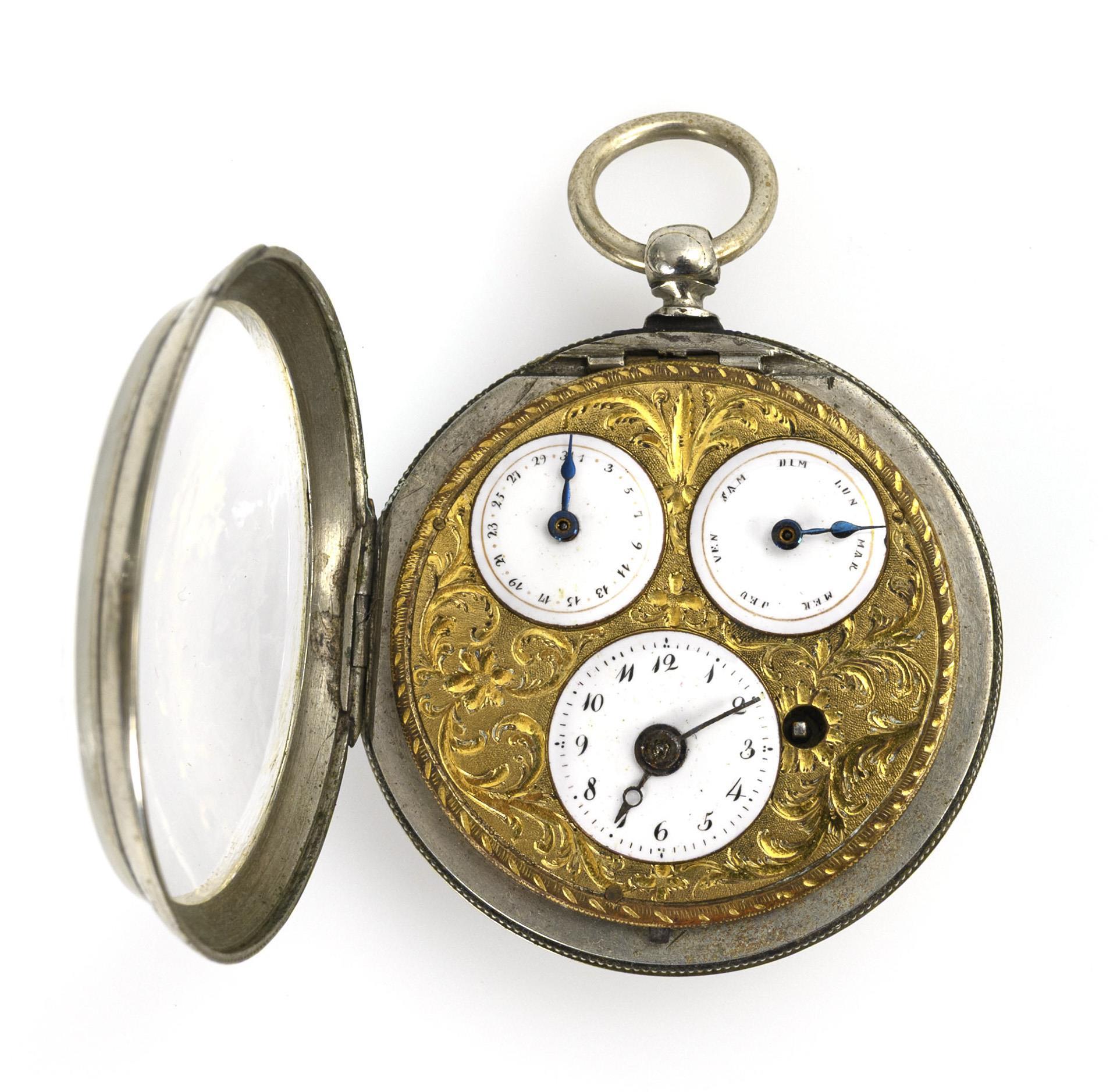 Unmarked brass full plate movement with florally pierced verge bridge, cylindrical movement pillars, verge escapement, chain and fusee, keywind. Functional in short time test. Florally engraved brass dial with 3 white enameled subsidiary dials for hours and minutes, date, day of the week (marked in French), partly blued hands.