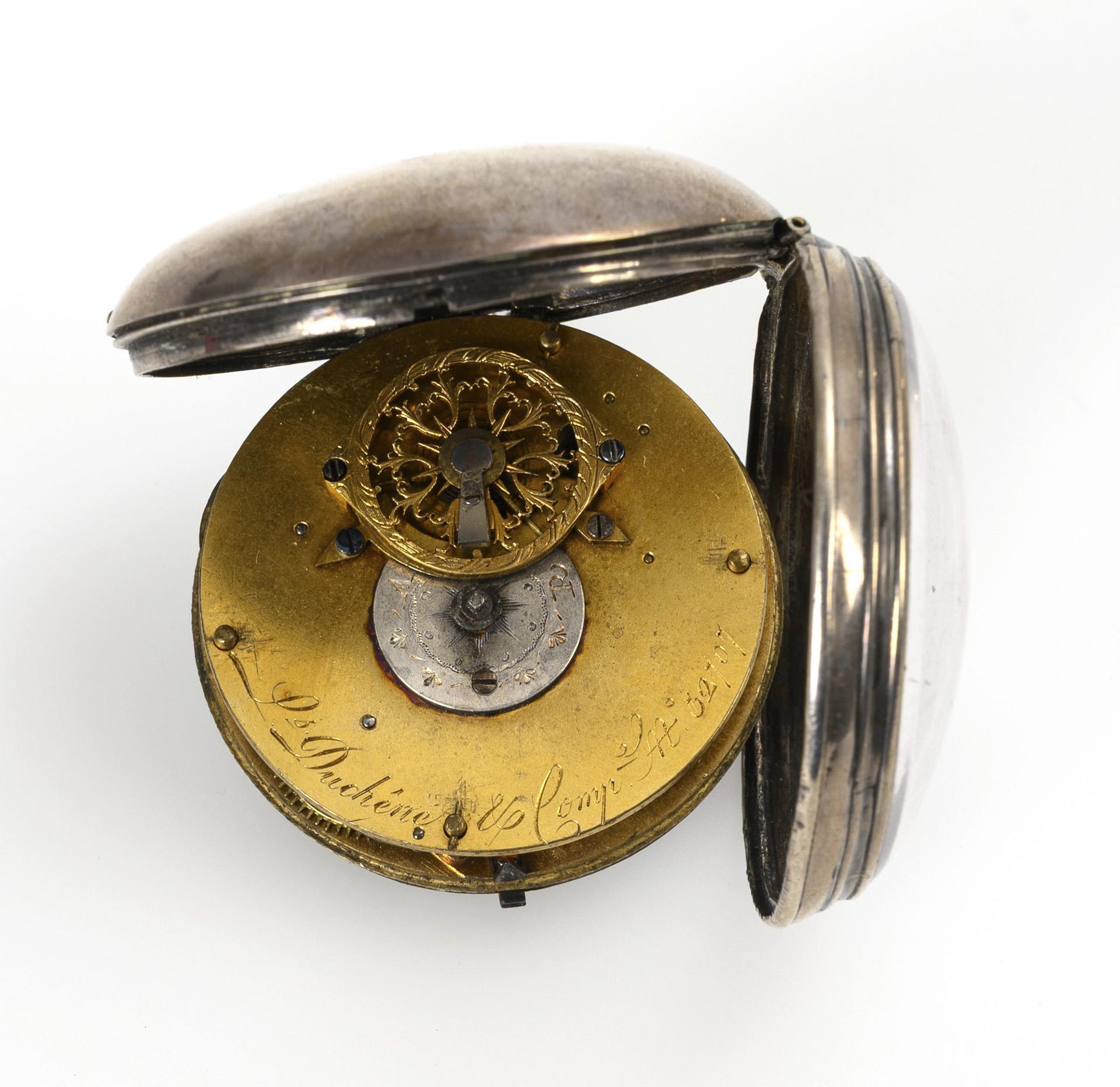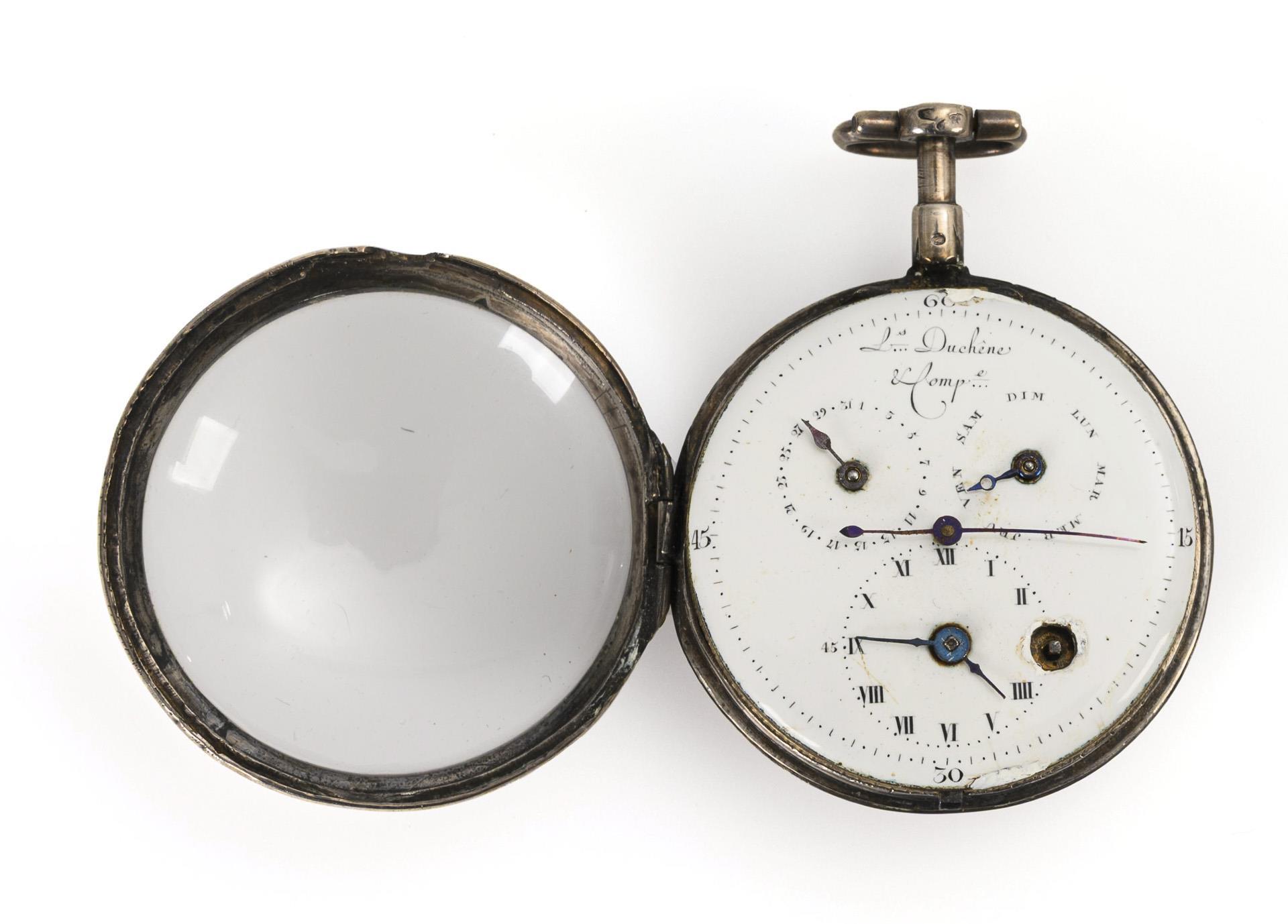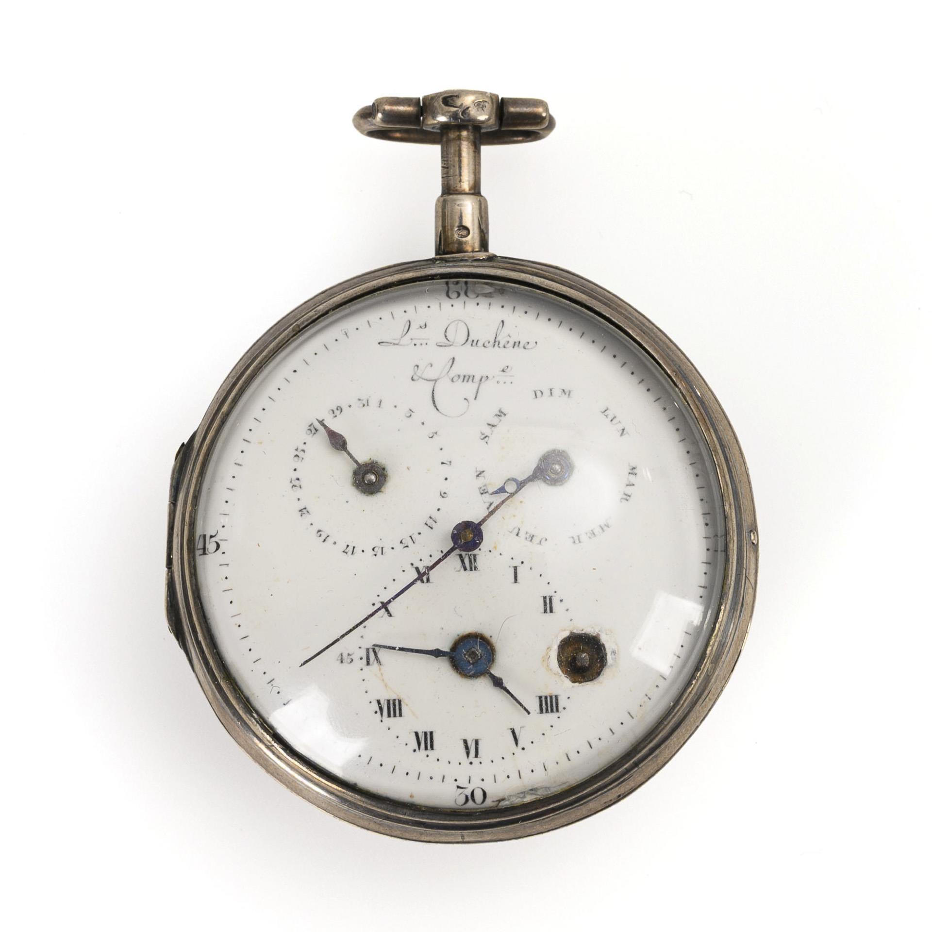 Silver verge pocket watch with date and day of the week. Louis Duchène & Compagnie, Geneva.