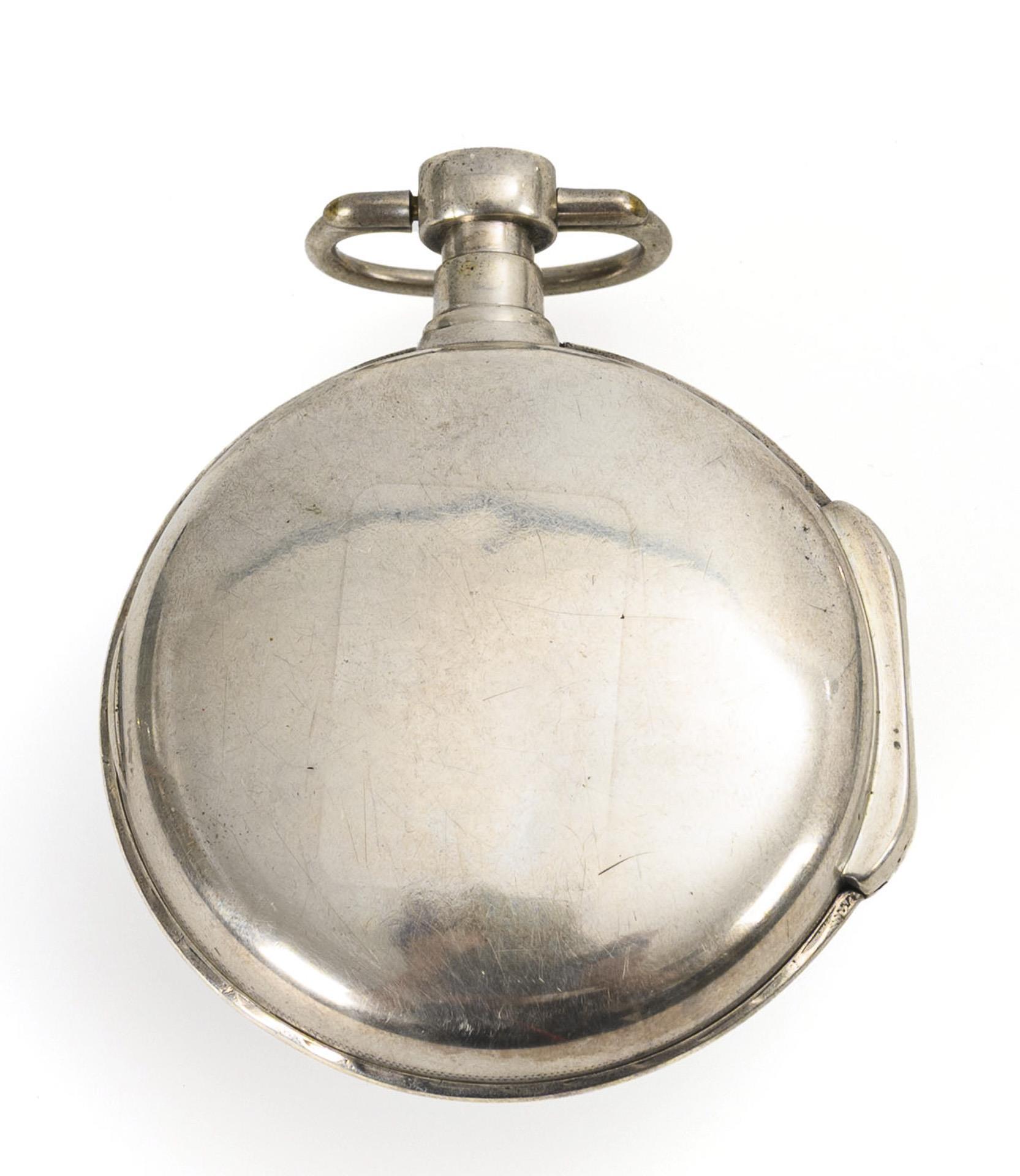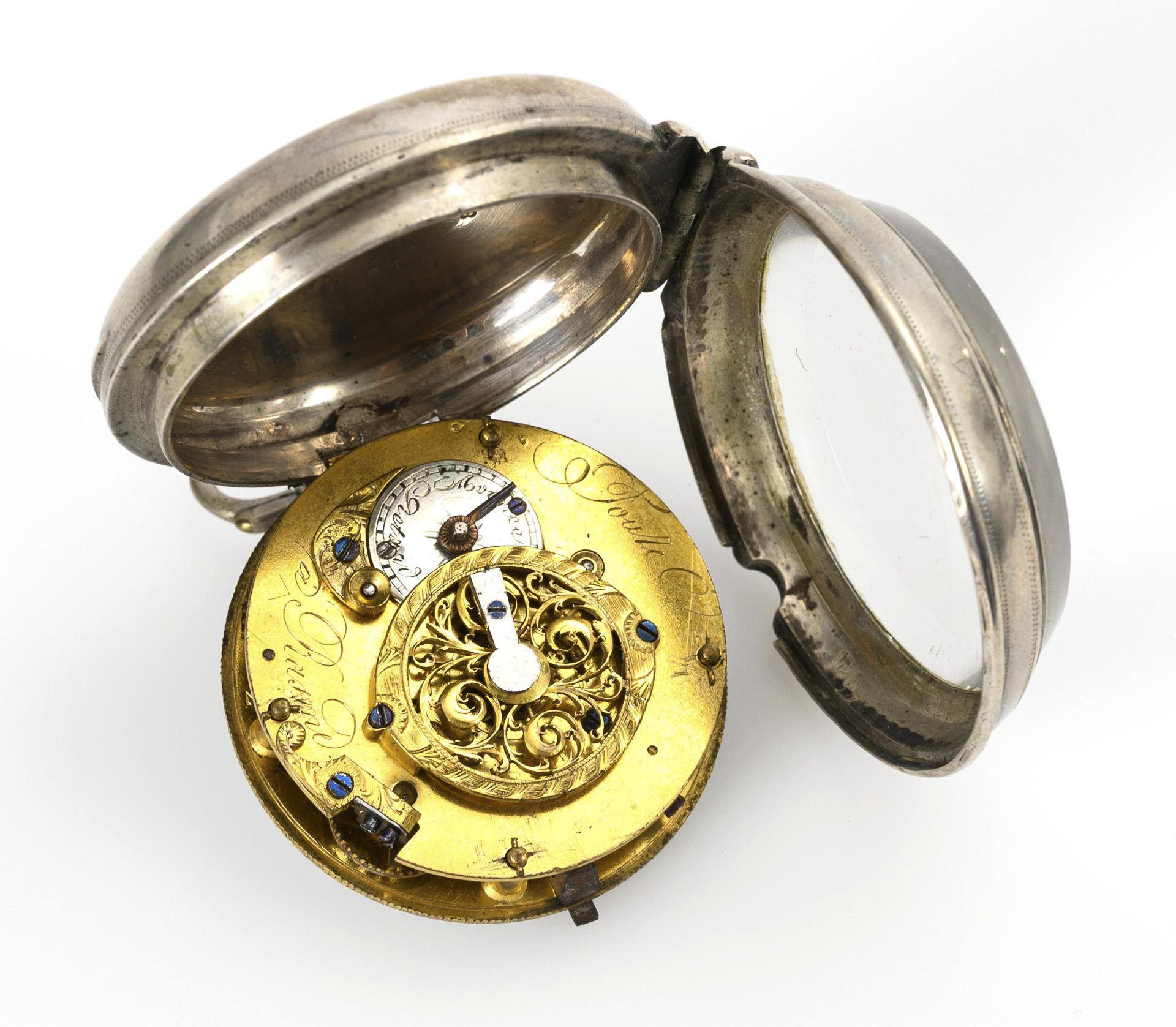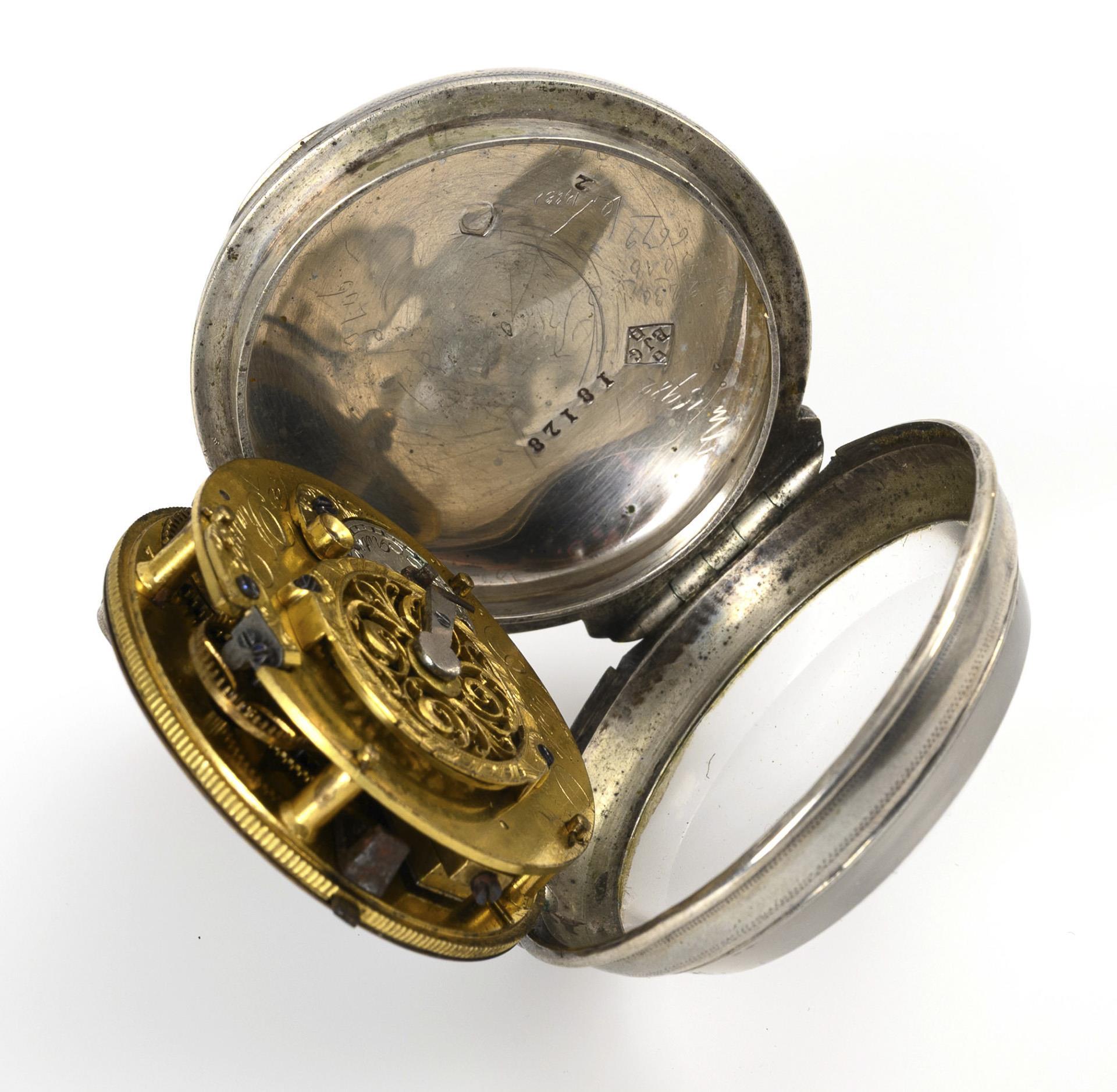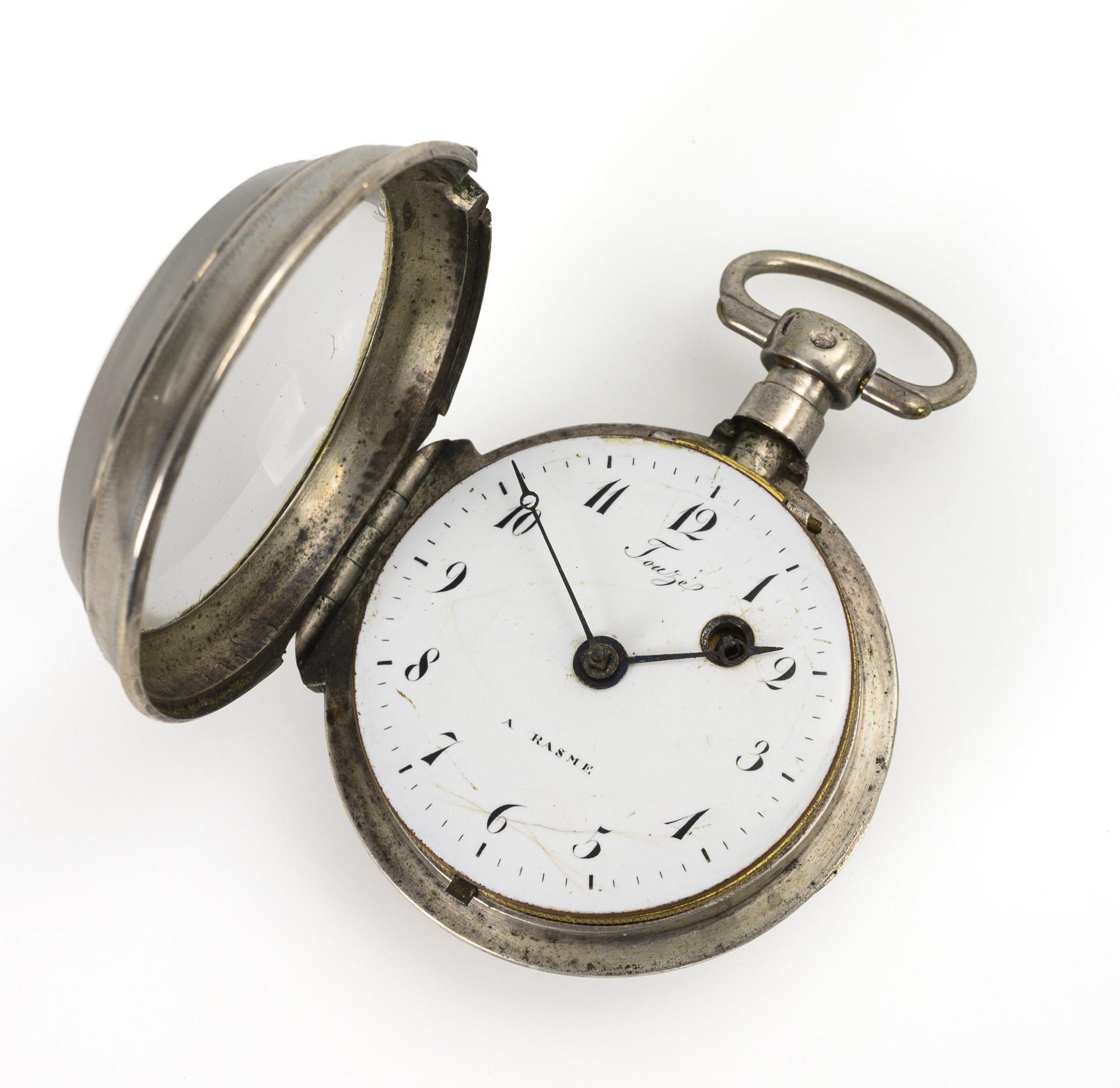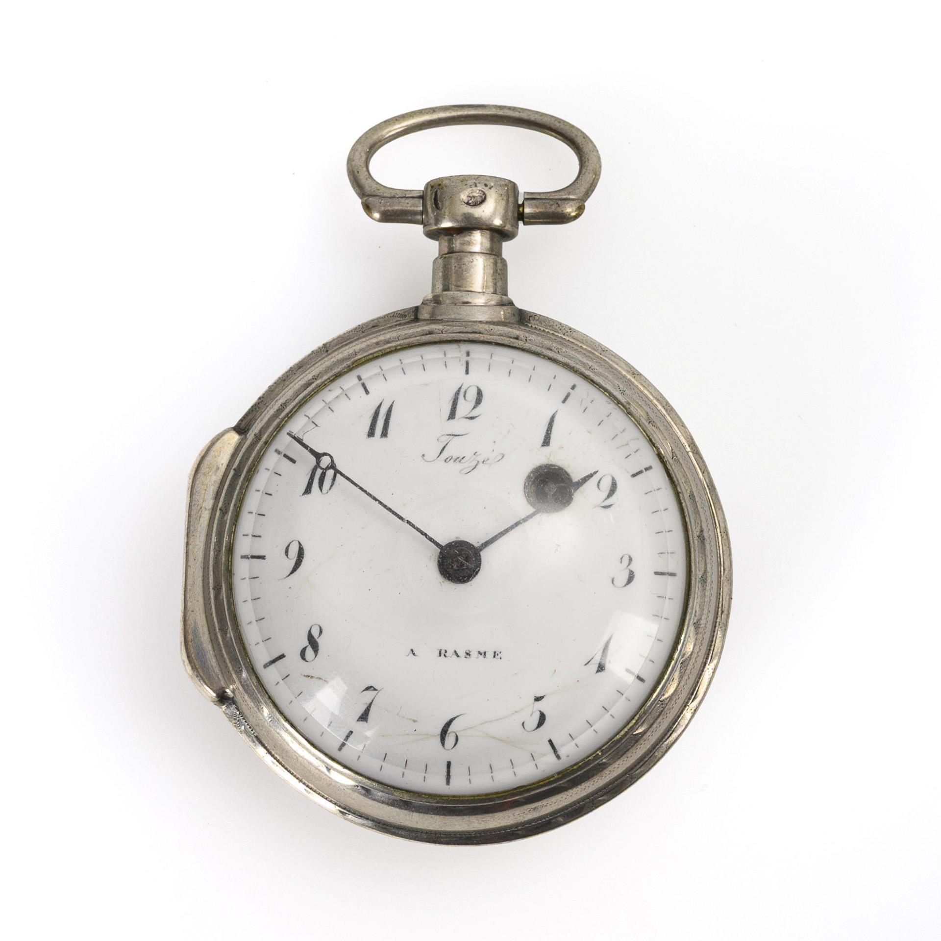 "Touzé à Rasme" signed brass full plate movement with florally pierced verge bridge, cylindrical movement pillars, blued screws, verge escapement, chain and fusee, keywind. Functional in short-term test, overhaul recommended. White enamel dial marked "Touzé à Rasme" with Arabic numerals, minute ring and Breguet hands.