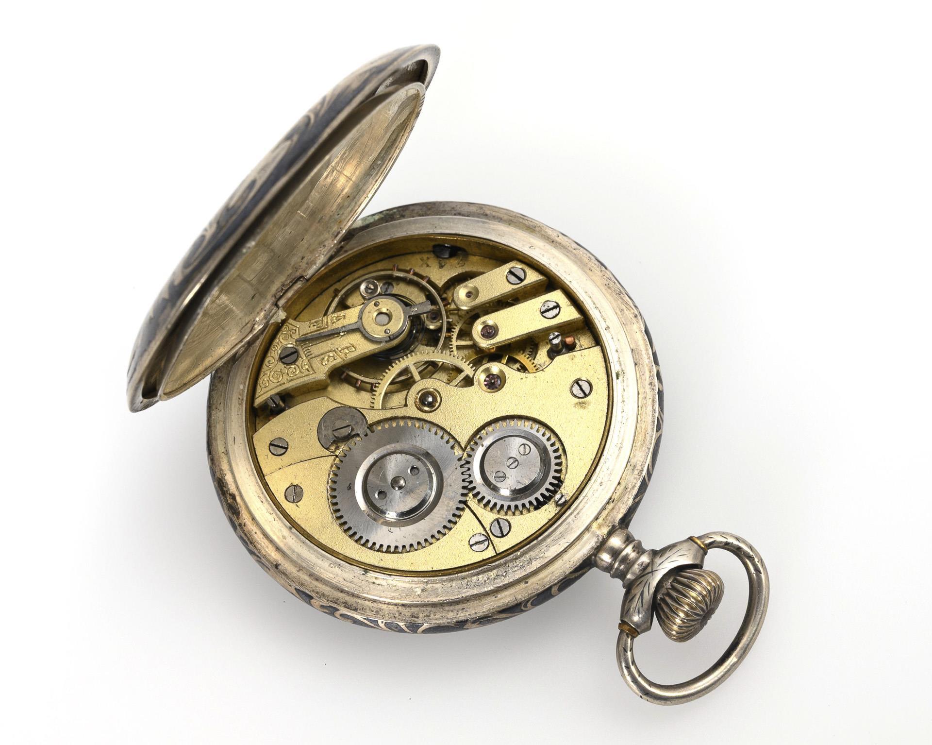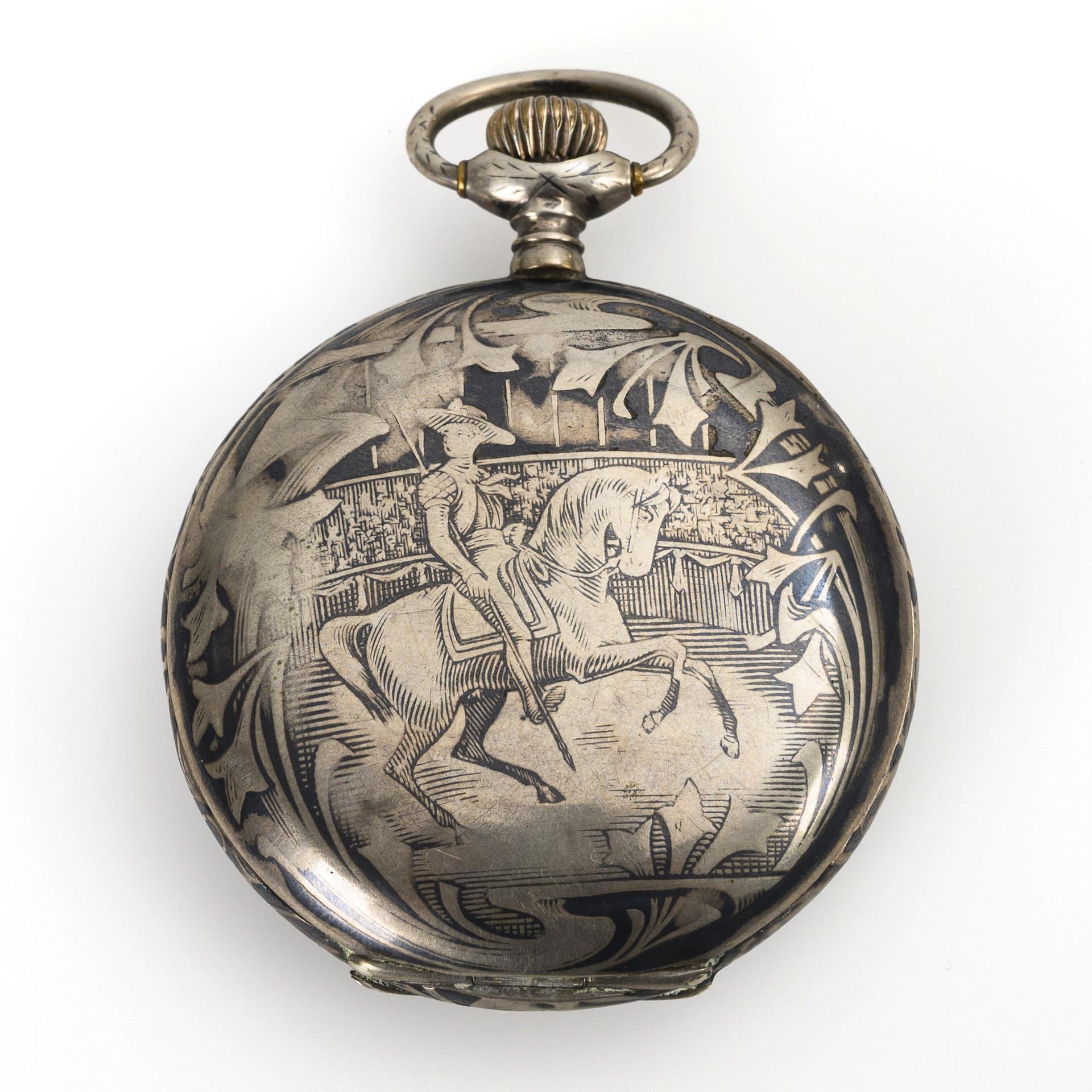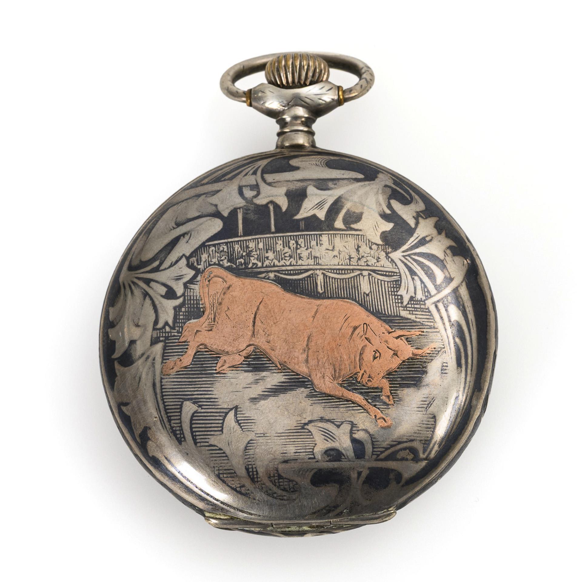 Silver sprung cover watch with bullfighting motifs in niello decoration.