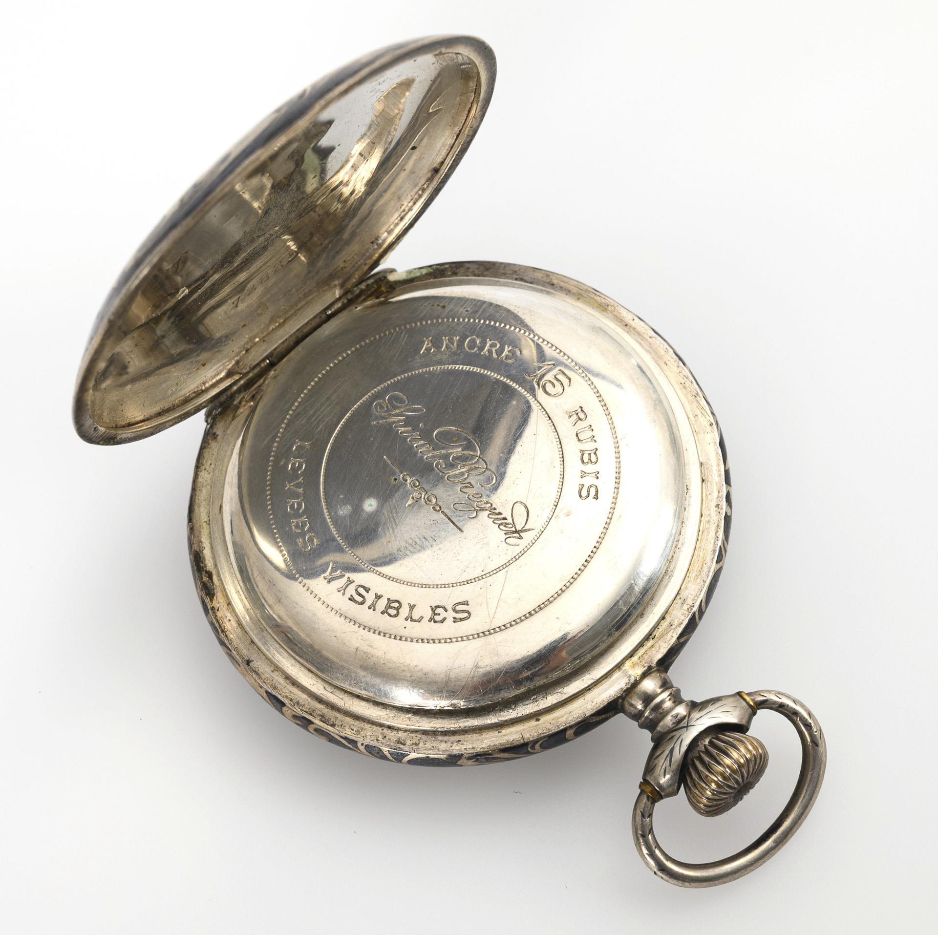 Unmarked movement with lever escapement and crown winding. Short running, in need of revision. White enamel dial marked "Spiral Breguet" with Roman numerals, minute ring, small second and Louis XV hands.
