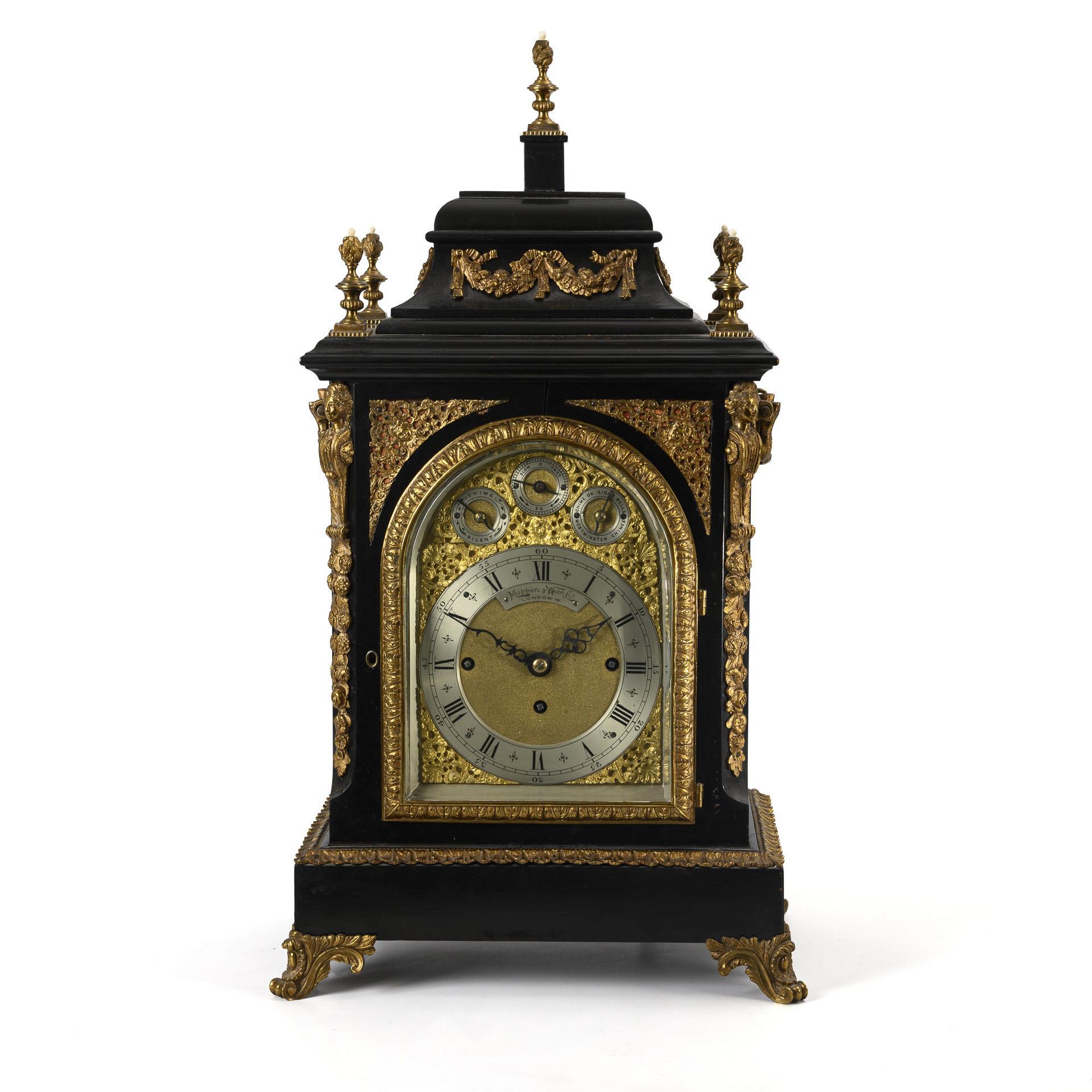 Brass plate movement with Graham escapement, quarter hour strike with carillon on 8 bells. Going and carillon movement functional in short time test, hour strike on round gong does not trigger, overhaul recommended. Brass front with floral relief decoration, silver-plated chapter ring with Roman hours and Arabic minutes, minute ring, stylized Louis XV iron hands. In the arch field 3 auxiliary leaves for rate regulation, activation of the strike and setting the strike to 8 chimes or Westminster strike, marked "Mappin & Webb Ltd. London W.".